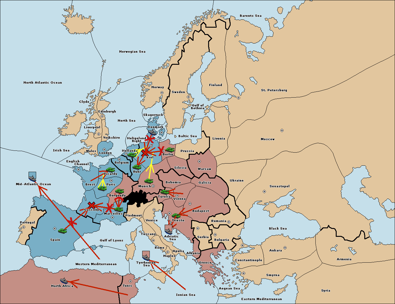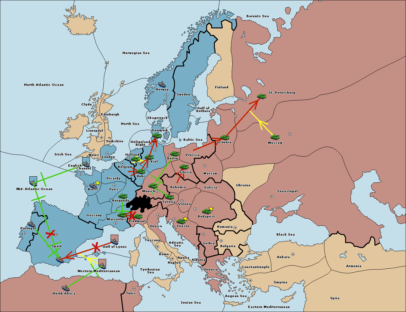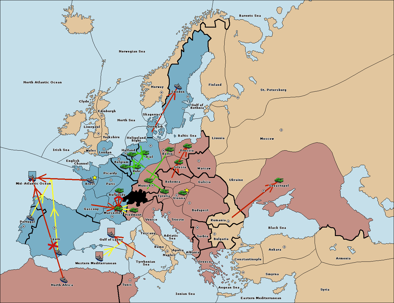 The fleet at Mid-Atlantic Ocean move to Western Mediterranean.