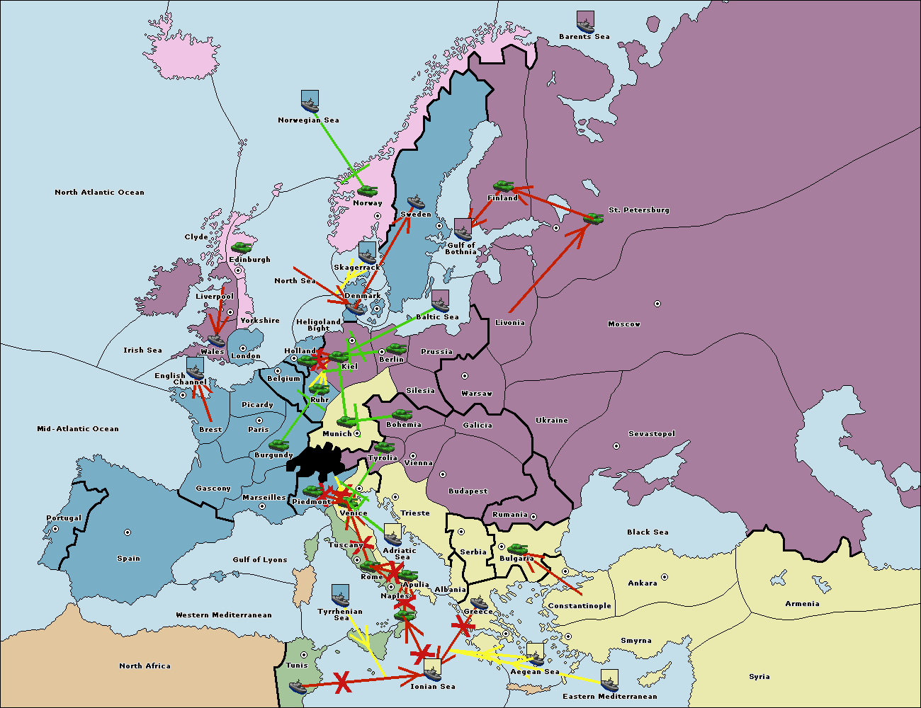 The fleet at Ionian Sea support hold to Tyrrhenian Sea.
