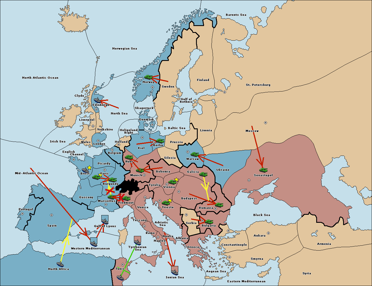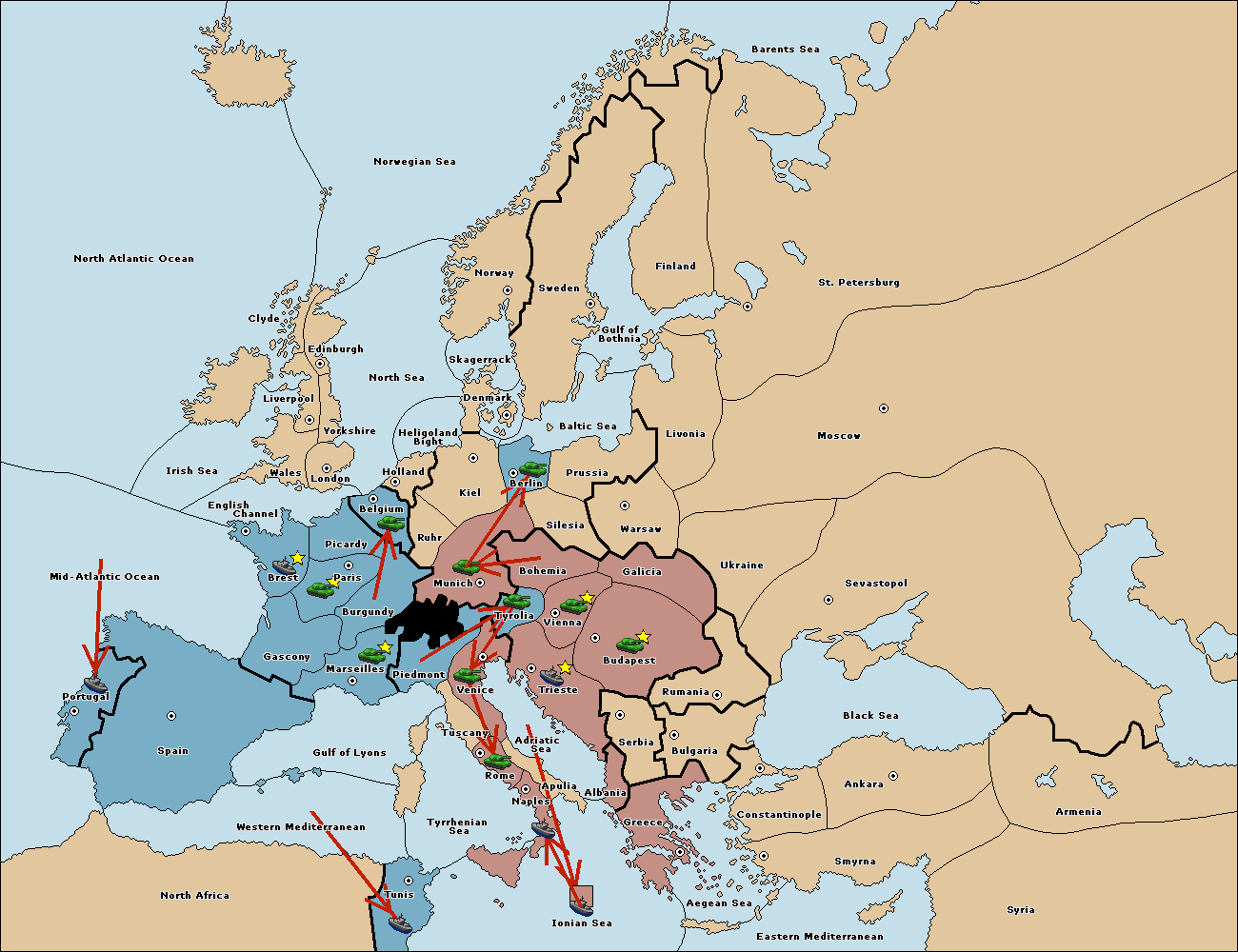 The fleet at Mid-Atlantic Ocean move to Western Mediterranean.