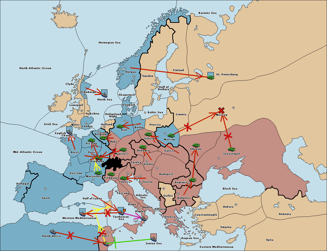 The fleet at Tyrrhenian Sea support move to Tunis from Ionian Sea.