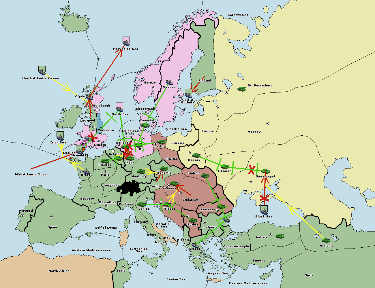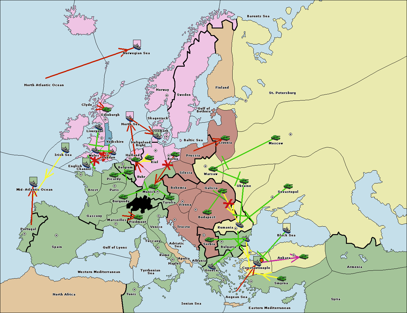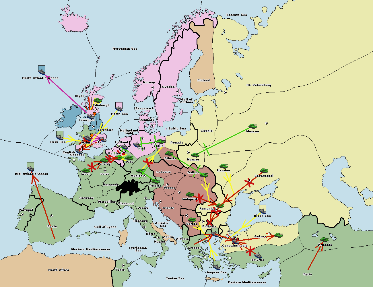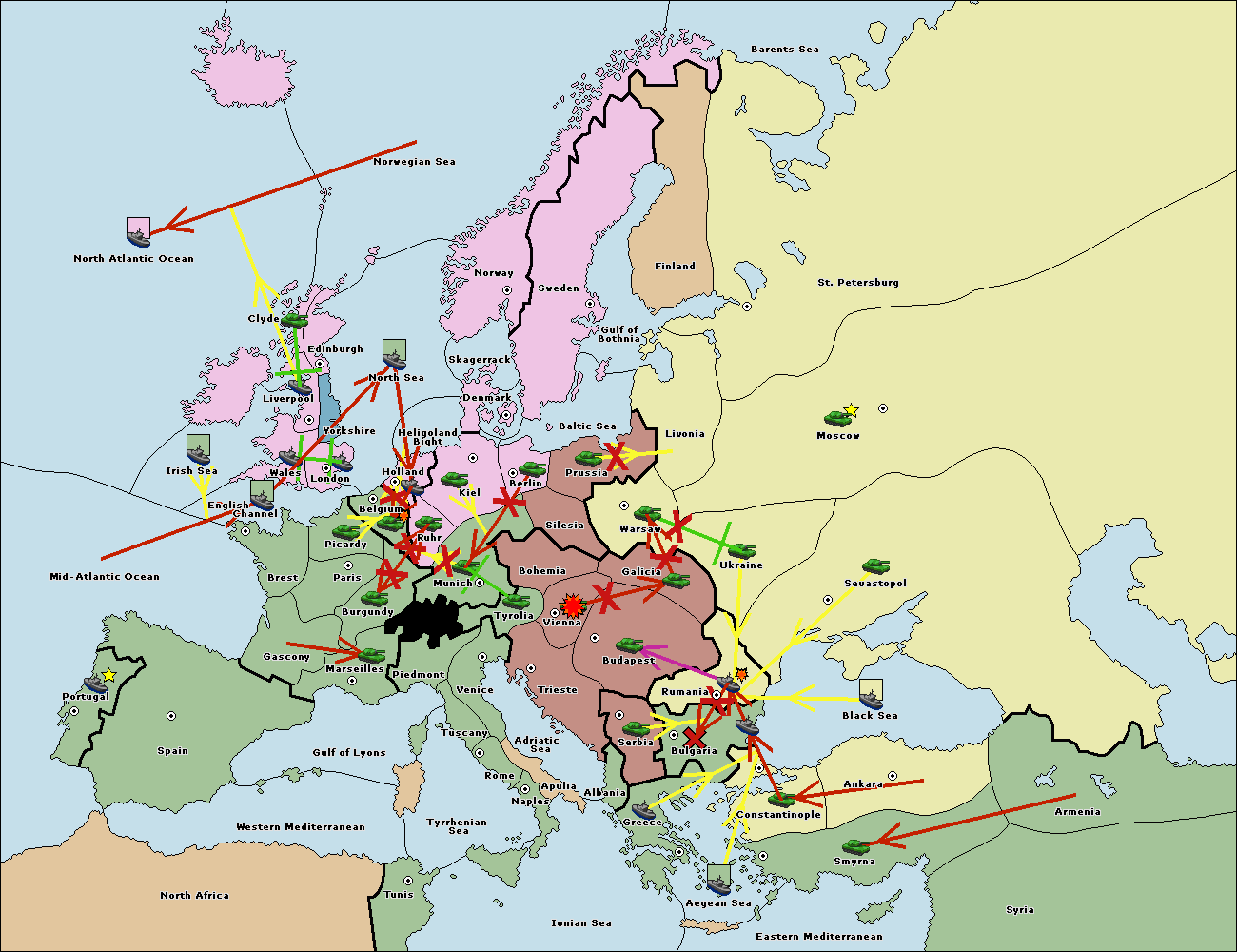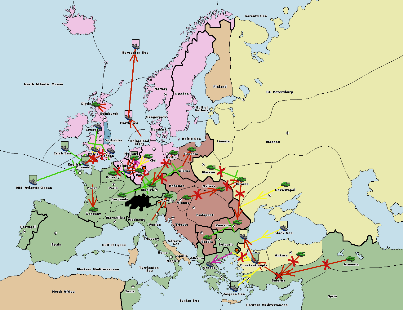 The fleet at Bulgaria (South Coast) support move to Aegean Sea from Smyrna.