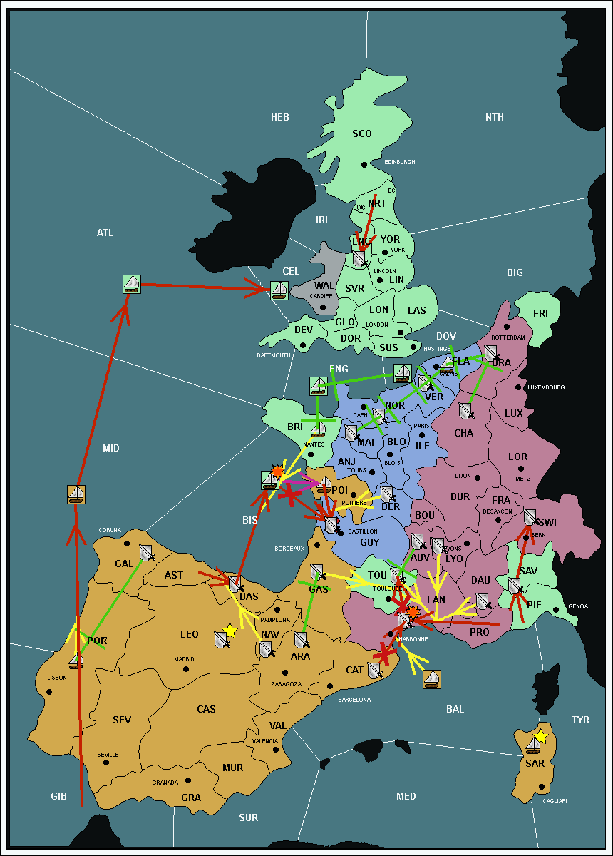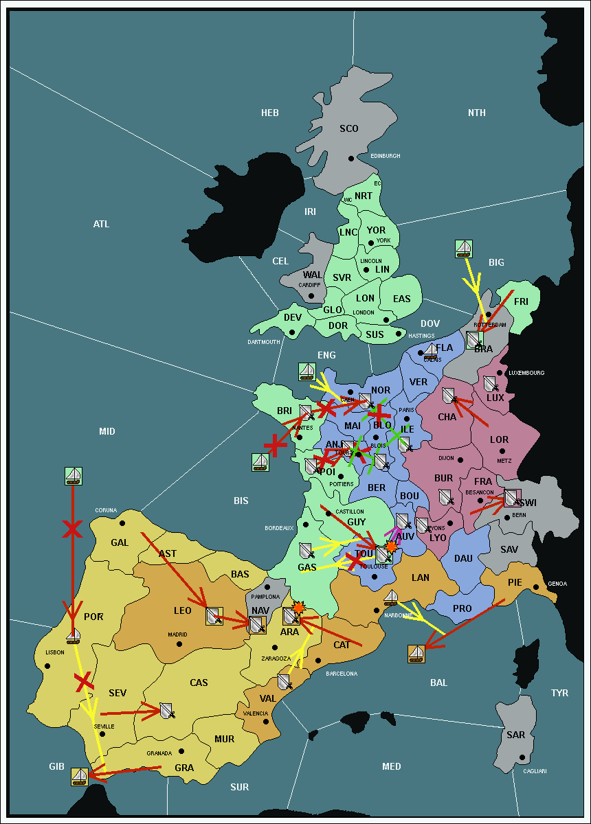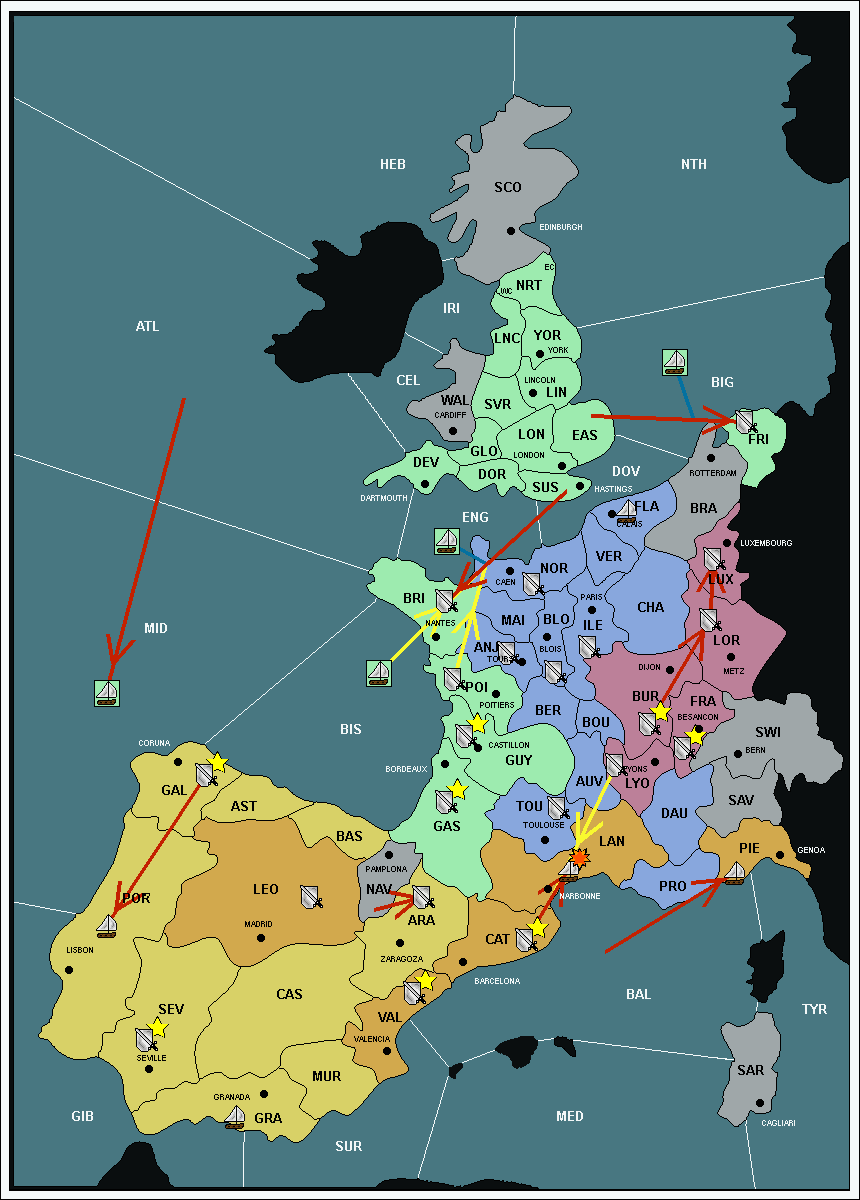 The army at Gascony (GAS) support move to Languedoc (LAN) from Catalonia (CAT).