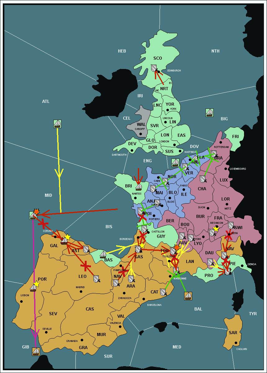 The fleet at Bay of Biscay (BIS) support move to Galicia (GAL) from Mid-Atlantic (MID).