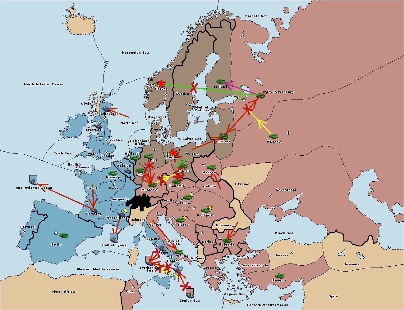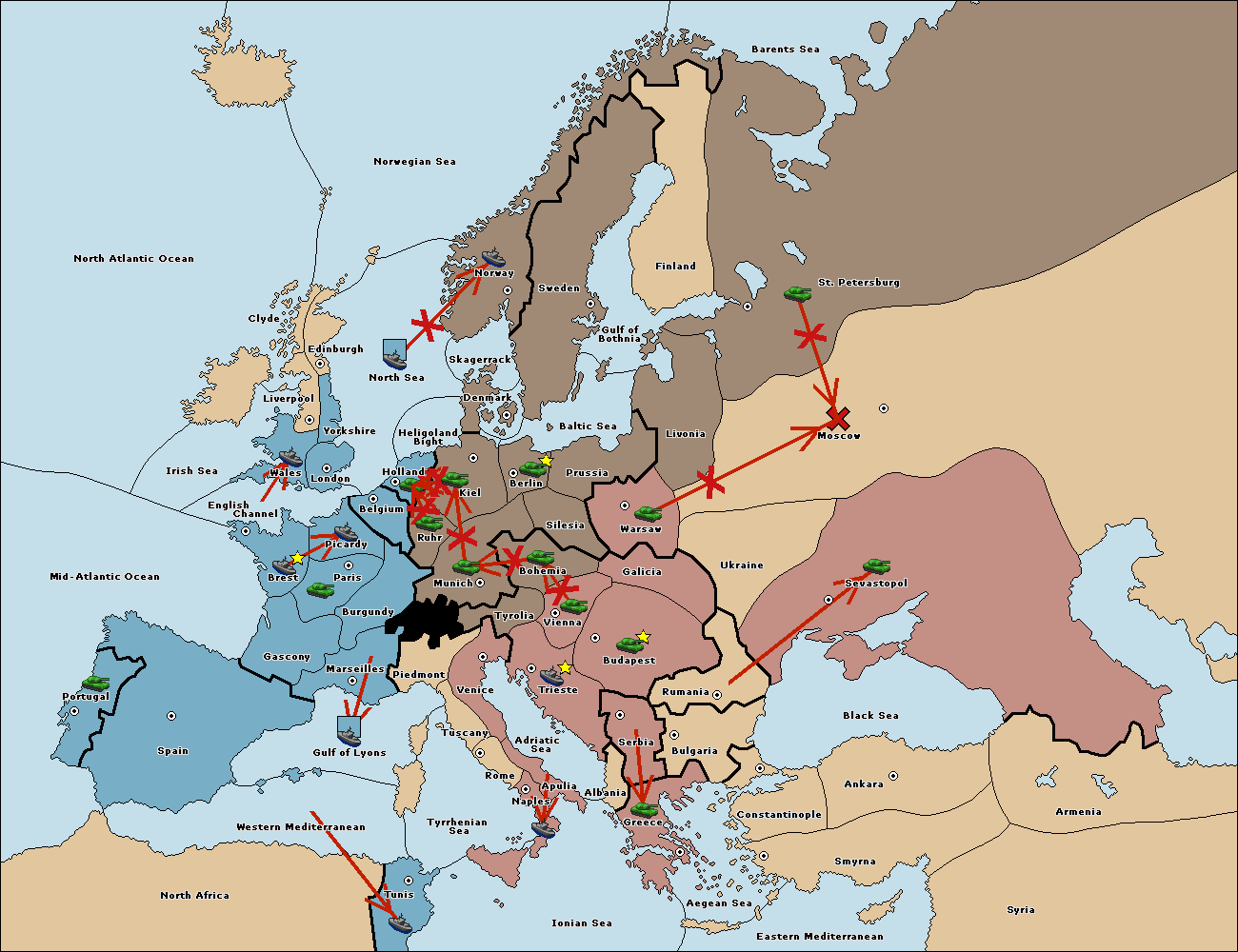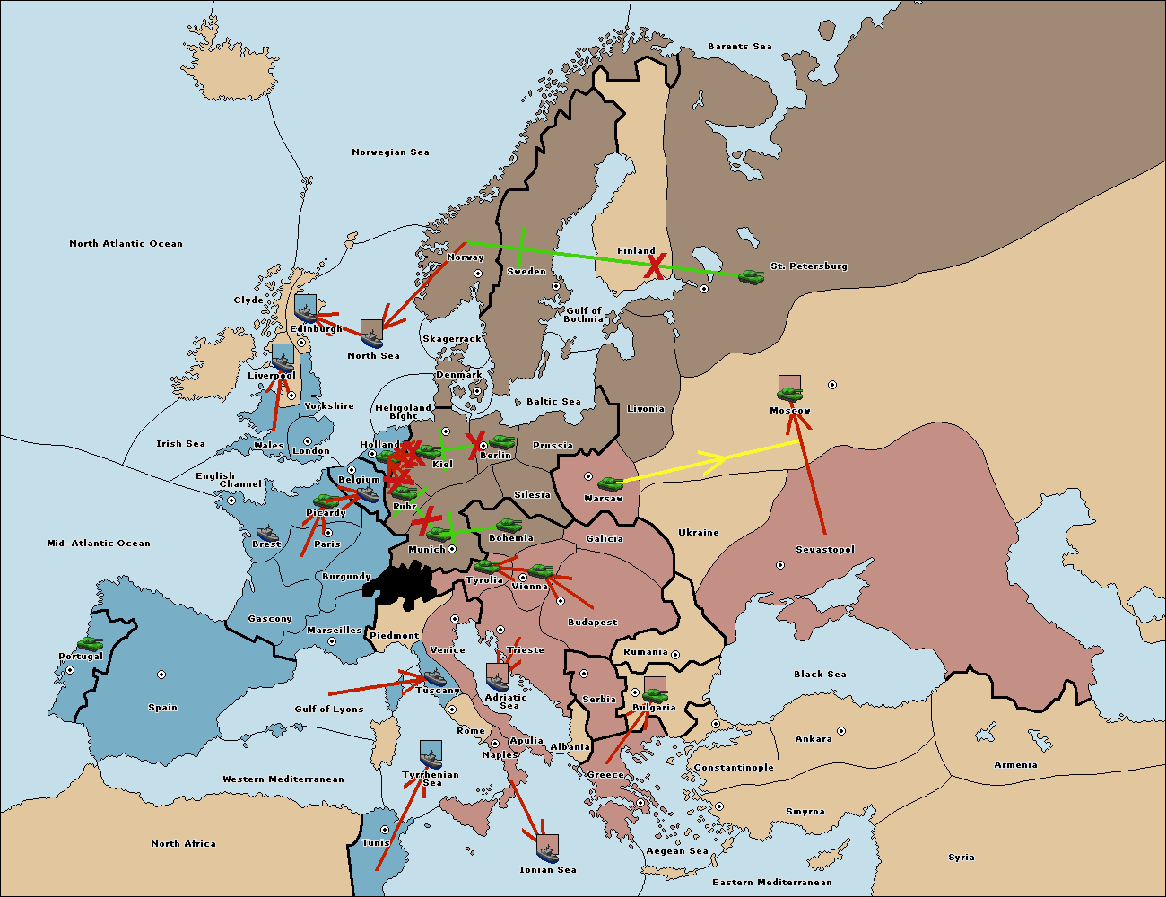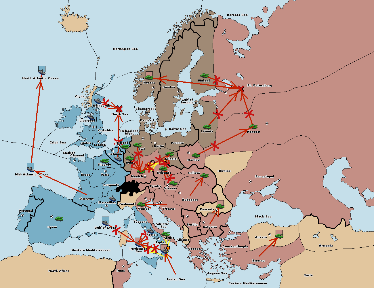 The fleet at Ionian Sea support move to Tyrrhenian Sea from Tunis.