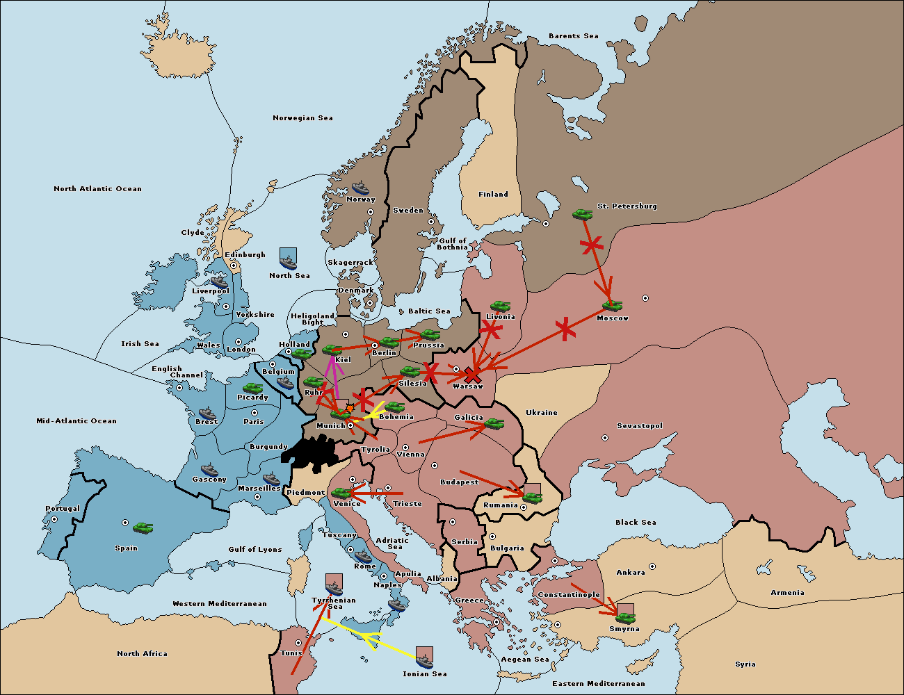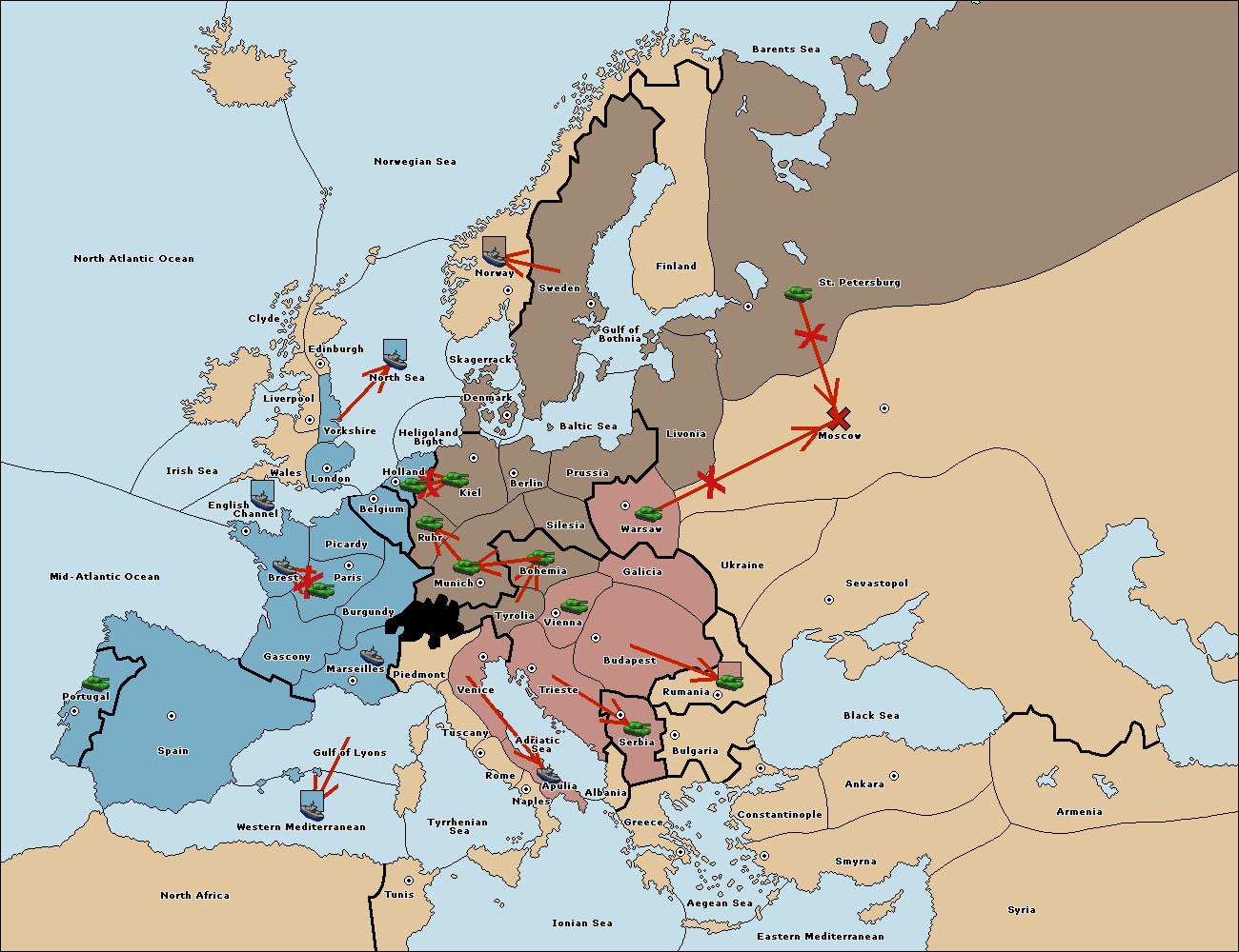 The army at Warsaw support move to Moscow from Sevastopol.