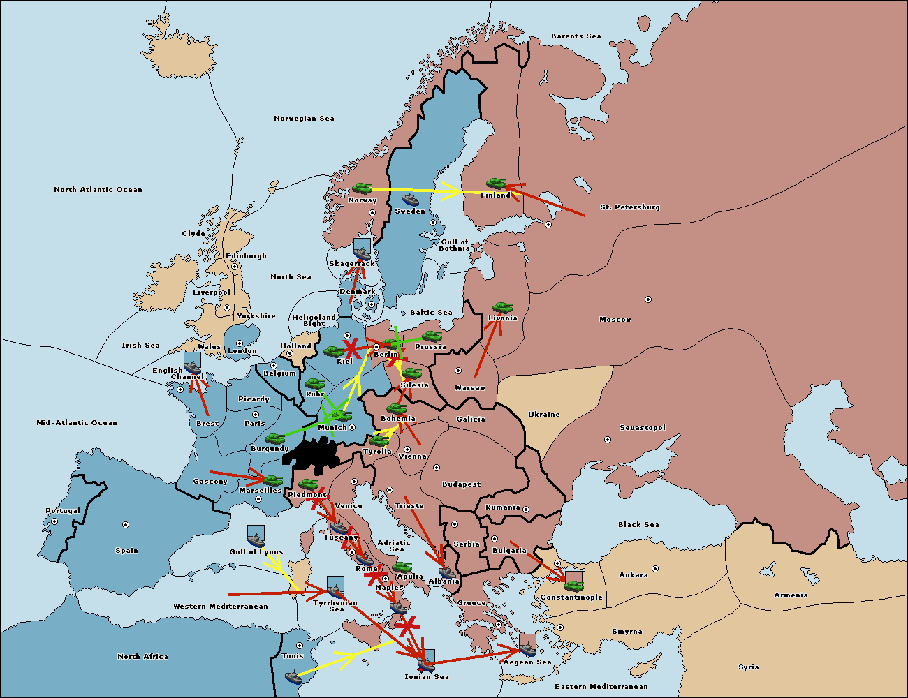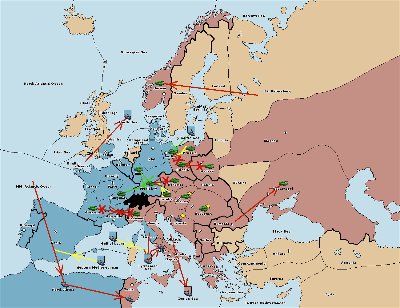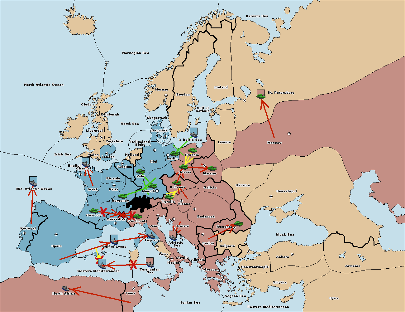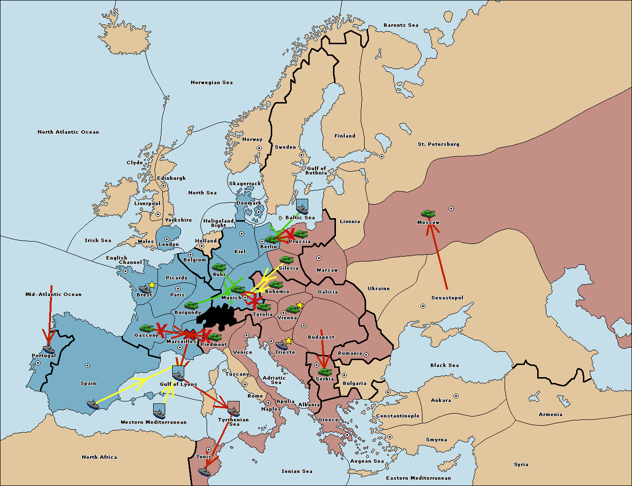 The fleet at Spain (South Coast) support move to Gulf of Lyons from Marseilles.
