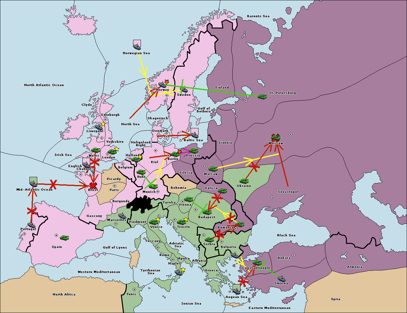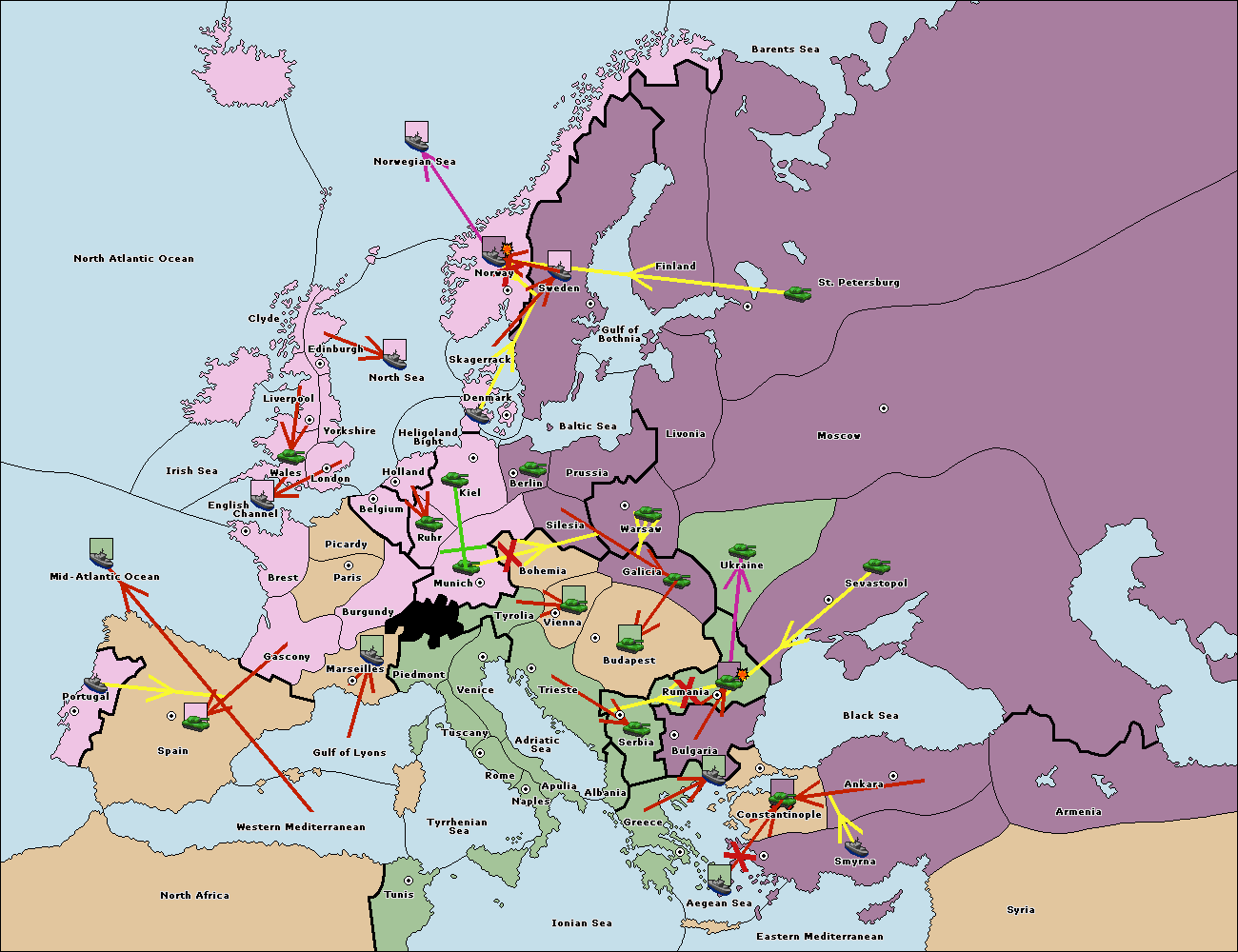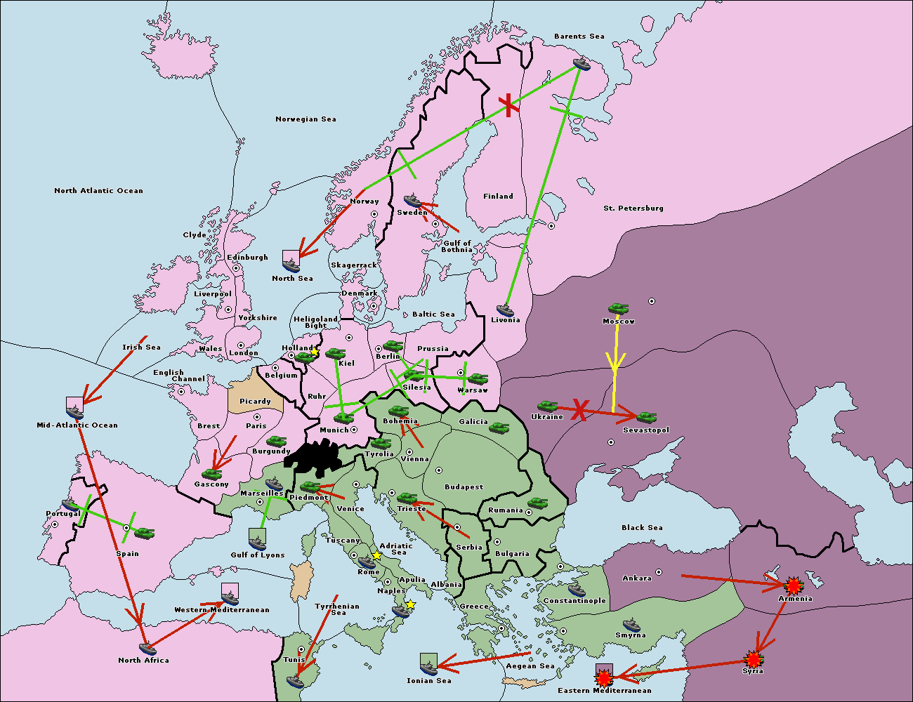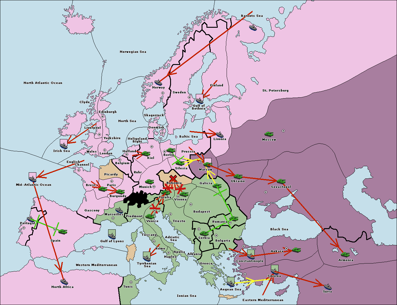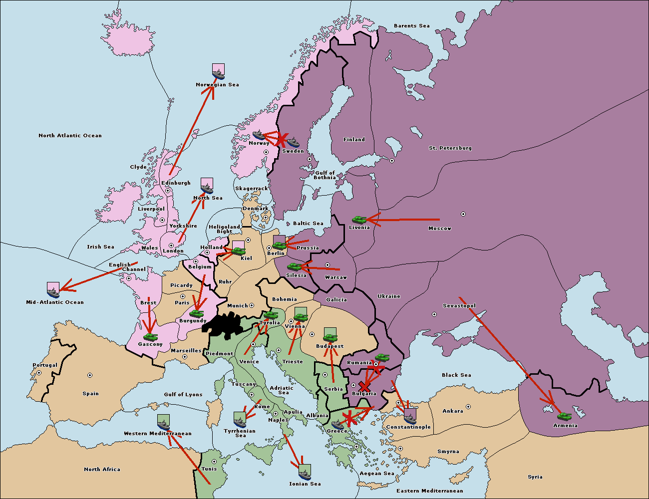 The fleet at Bulgaria (South Coast) support move to Constantinople from Aegean Sea.