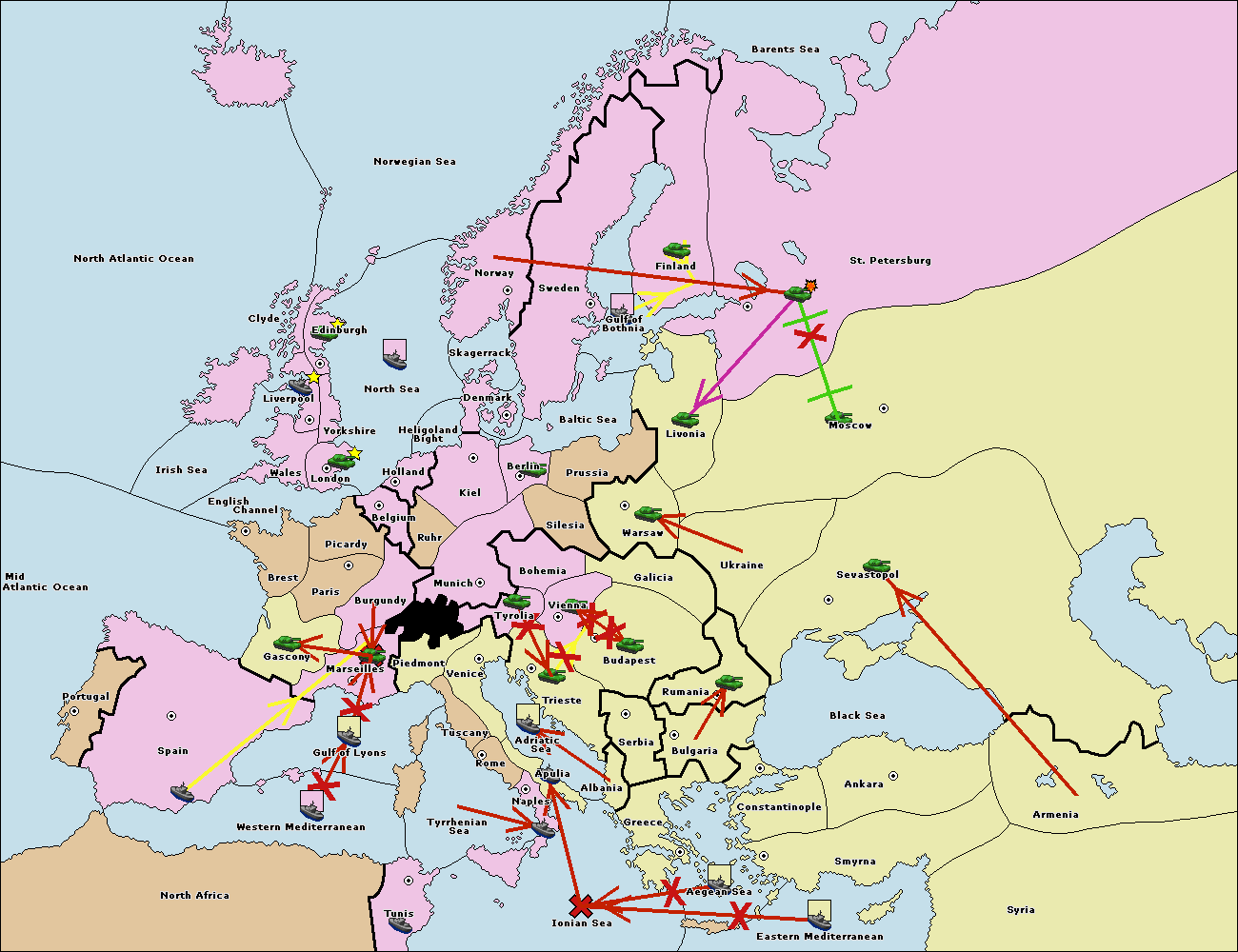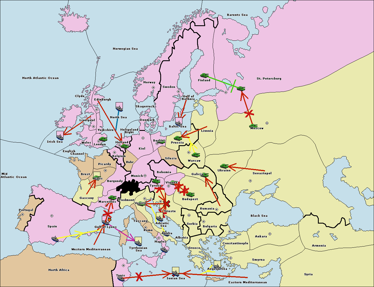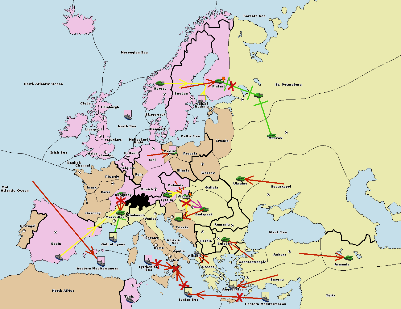 The fleet at Spain (South Coast) support move to Gulf of Lyons from Western Mediterranean.