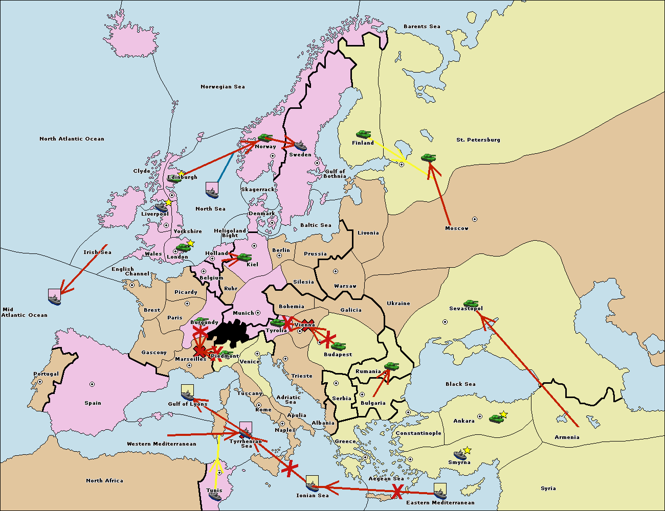 The fleet at Spain (South Coast) support move to Marseilles from Burgundy.