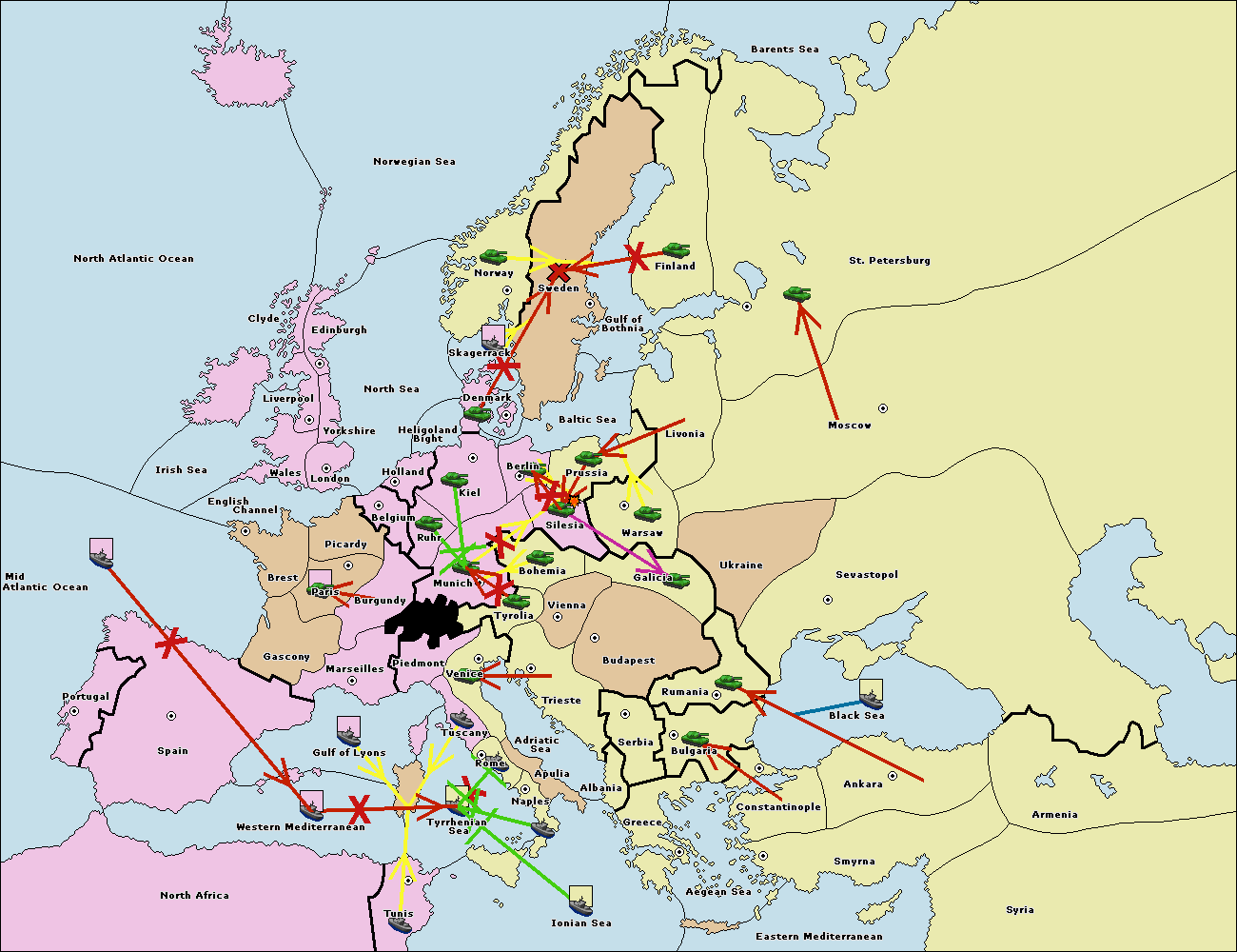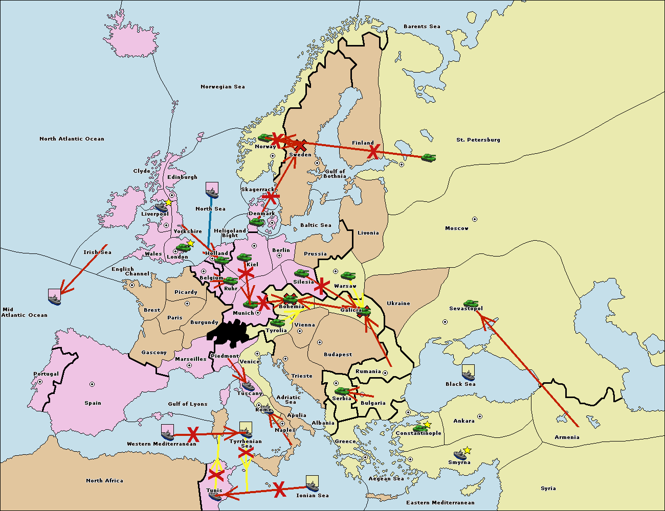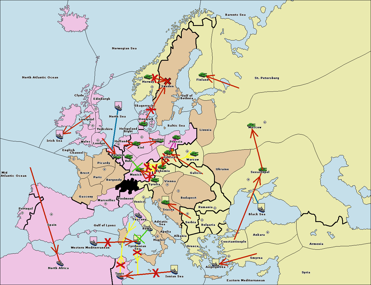 The fleet at Tyrrhenian Sea support move to Tunis from Ionian Sea.