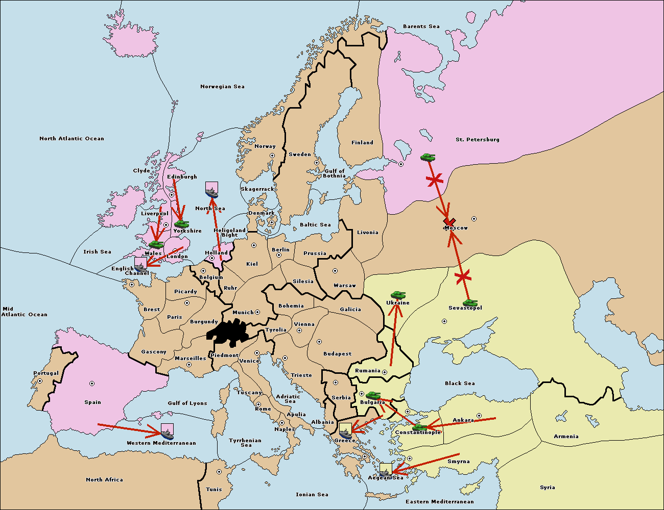 The fleet at Constantinople move to Bulgaria (South Coast).