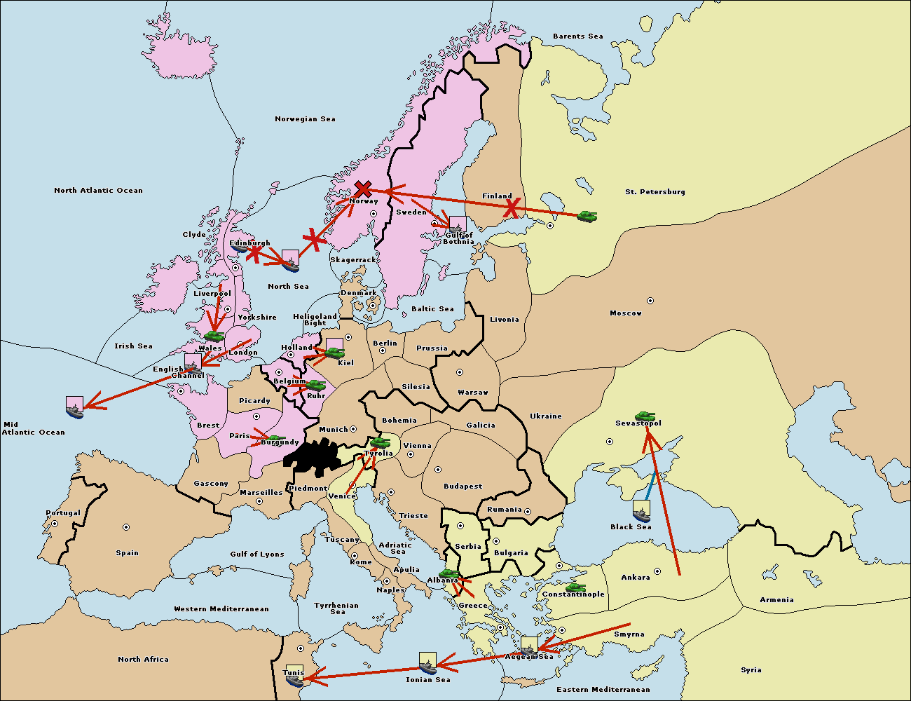 The fleet at Gulf of Bothnia move to St. Petersburg (South Coast).