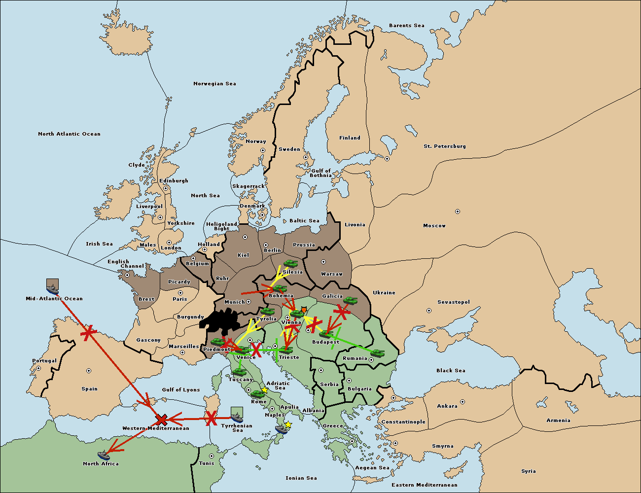 The army at Tyrolia support move to Vienna from Bohemia.