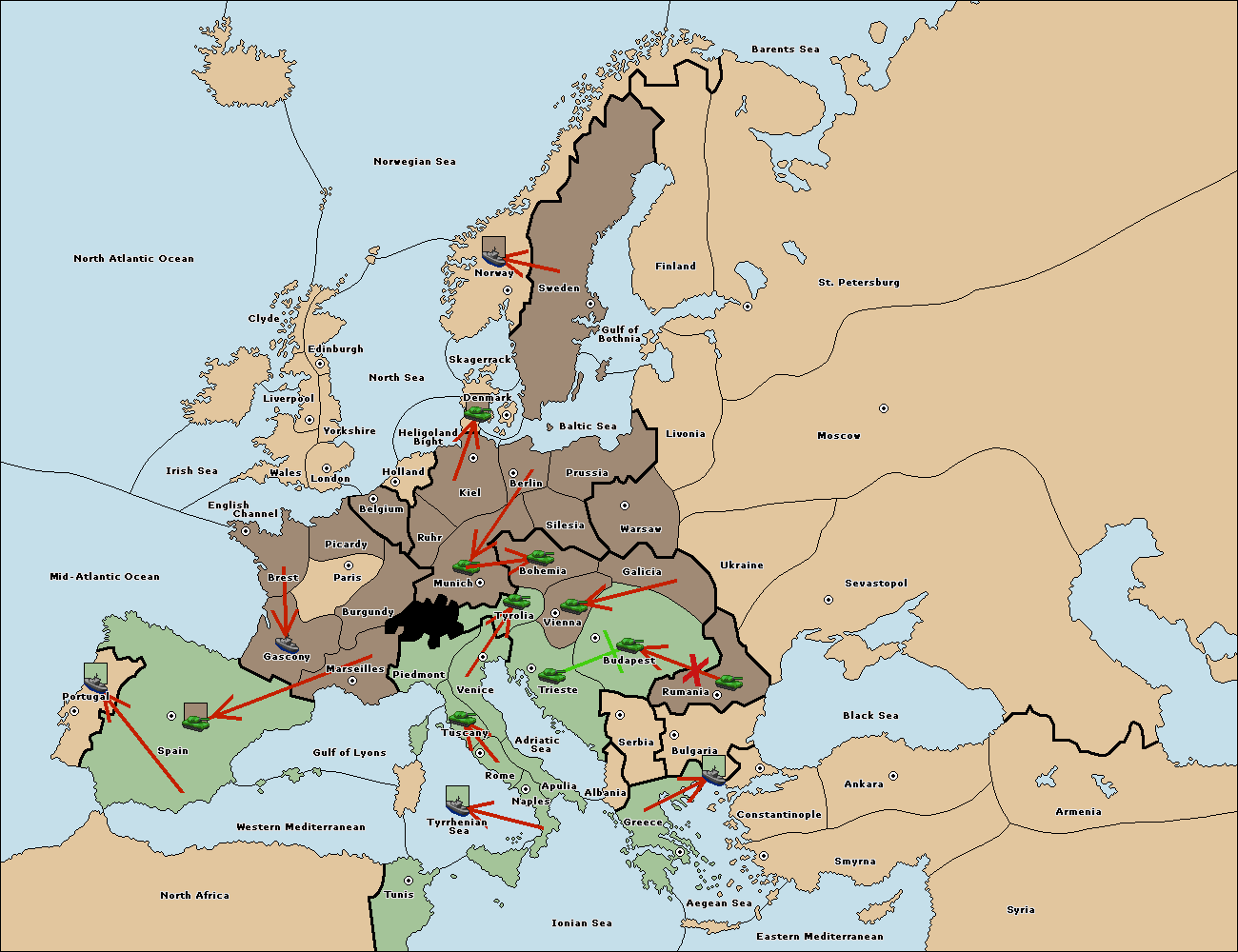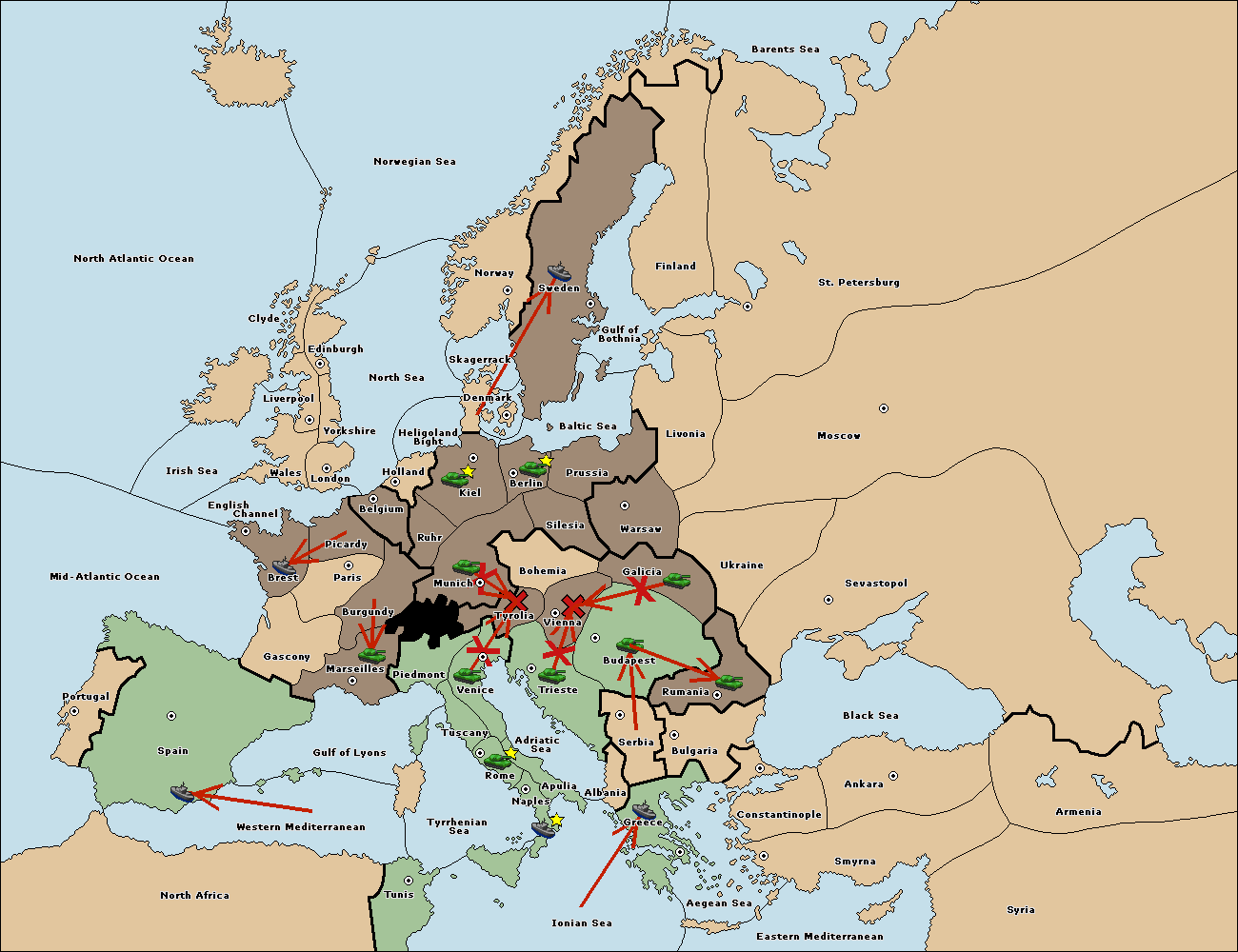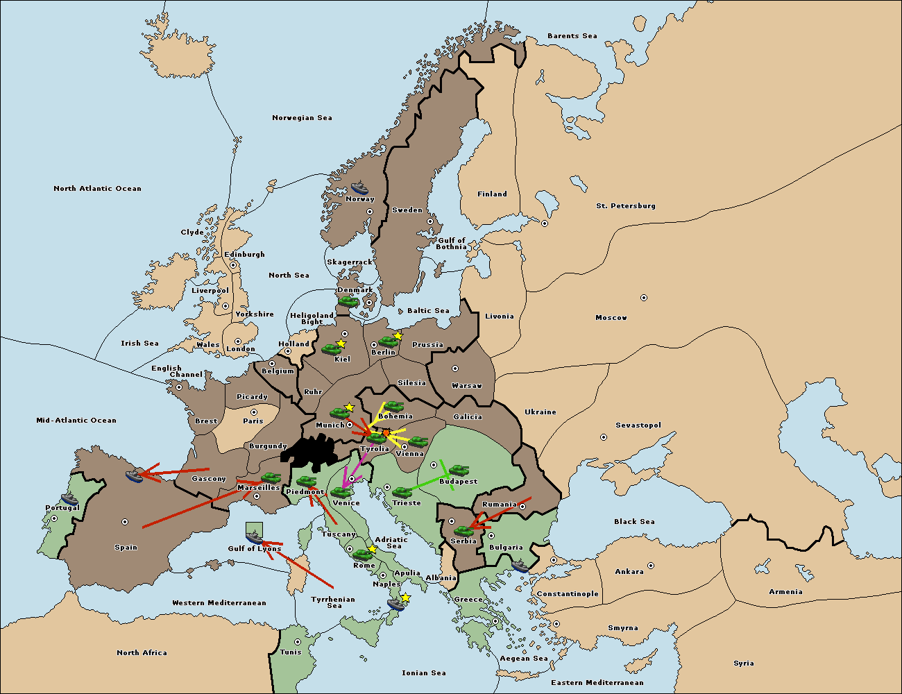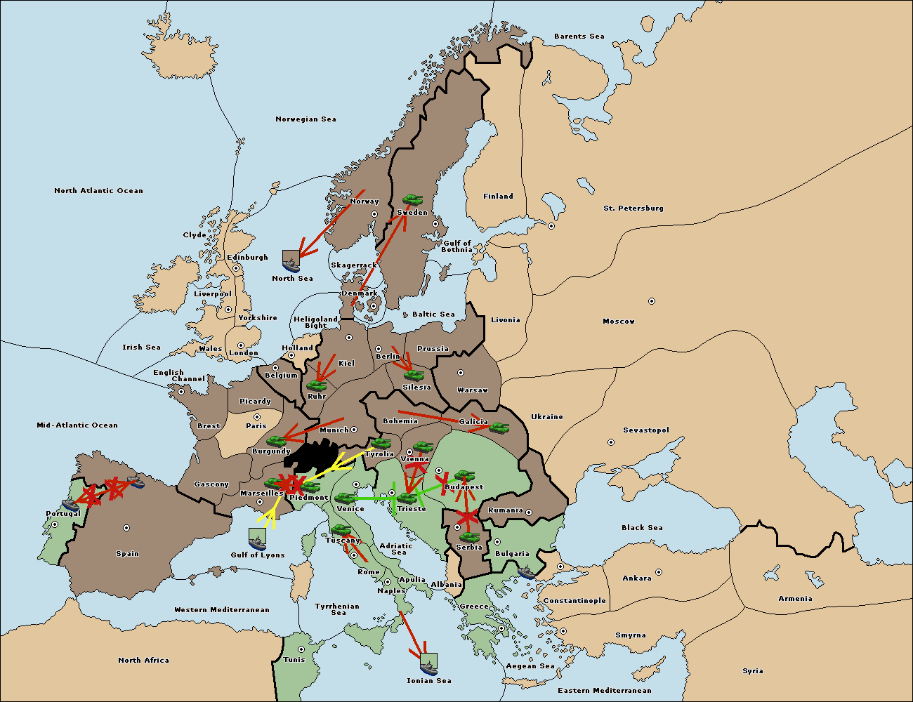 The army at Tyrolia support move to Piedmont from Marseilles.