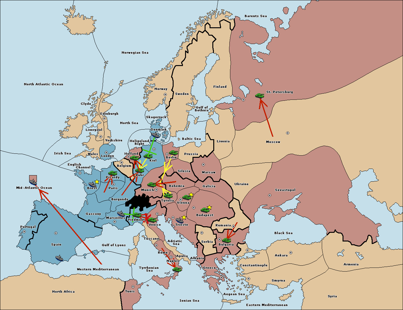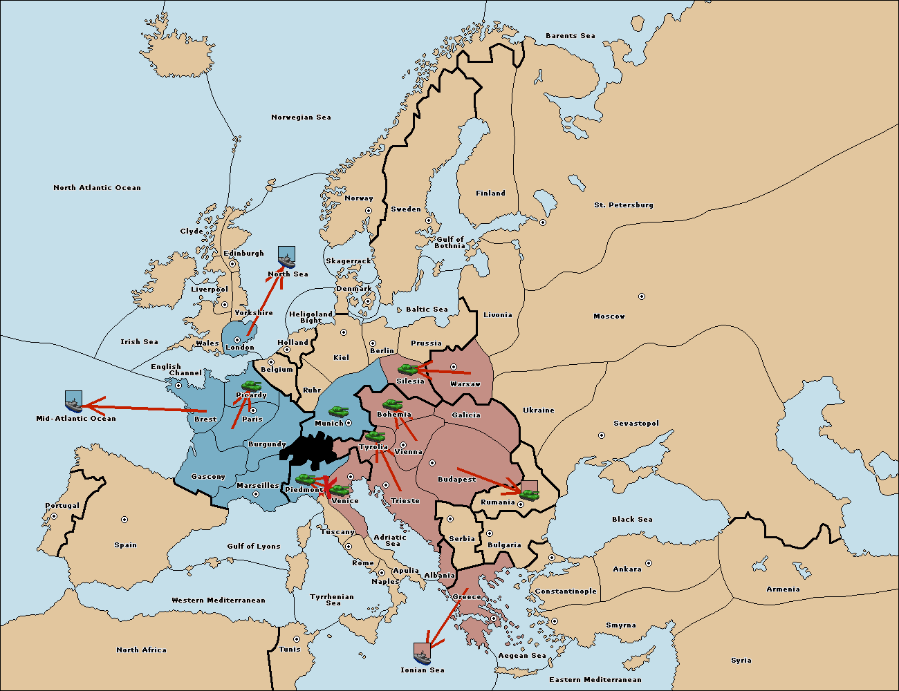 The army at Tyrolia support move to Piedmont from Venice.
