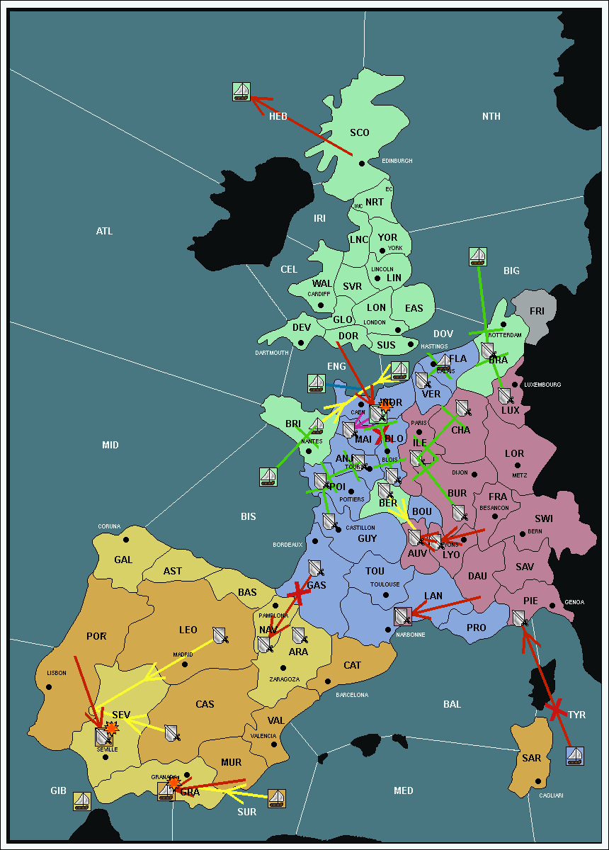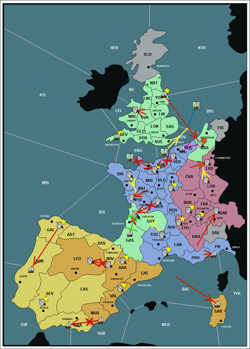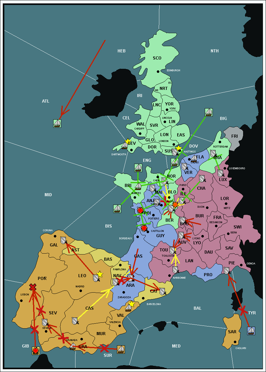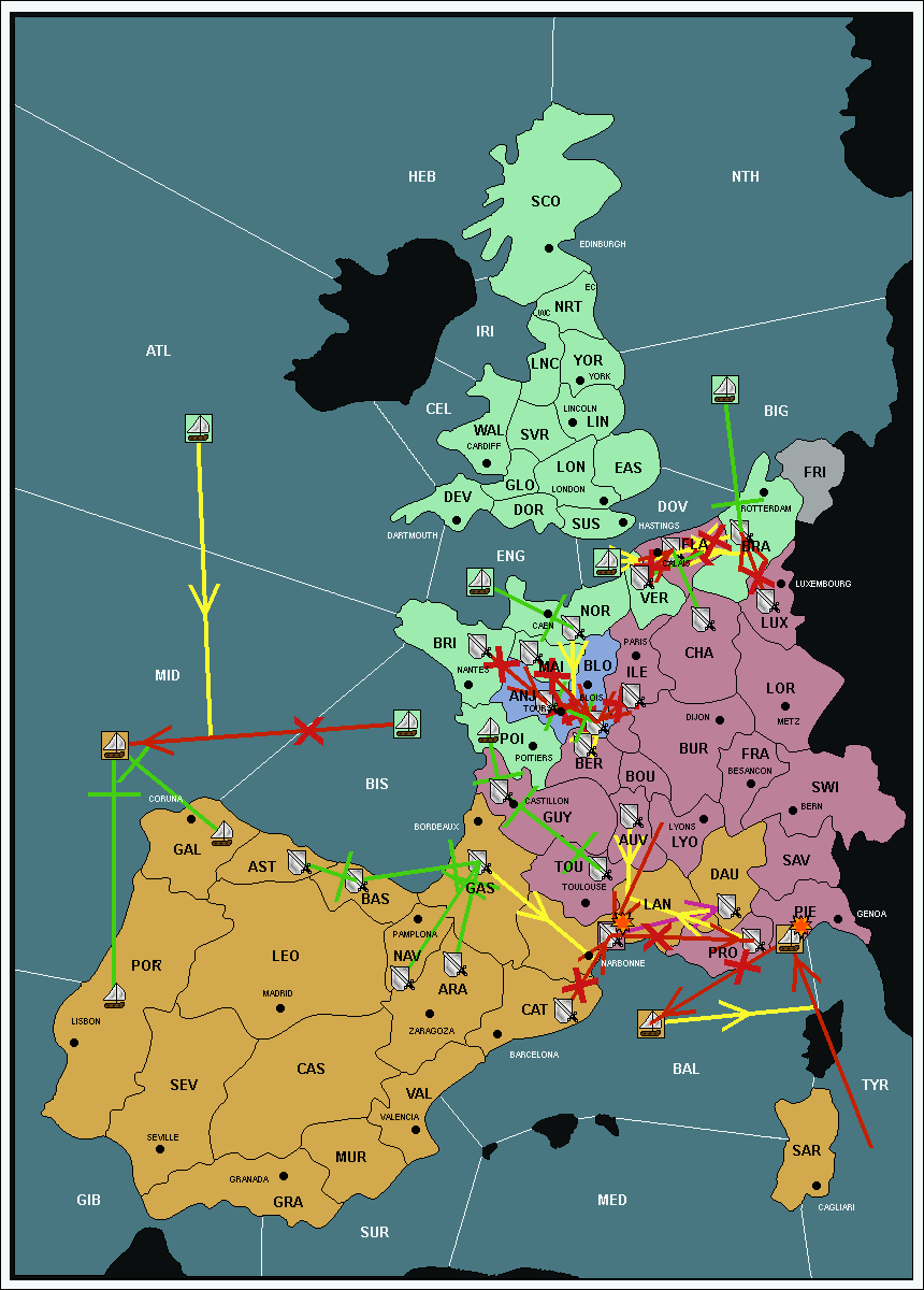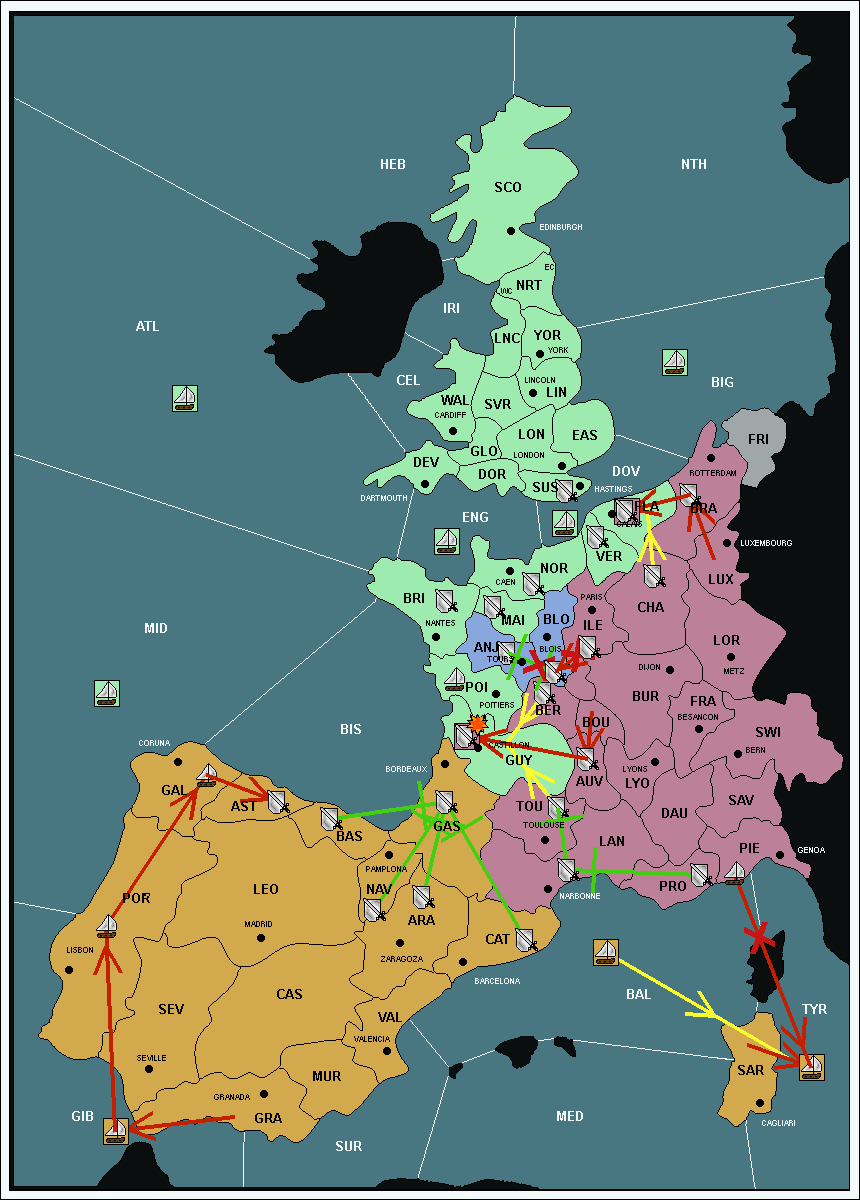 The fleet at Mid-Atlantic (MID) support move to Bay of Biscay (BIS) from Galicia (GAL).