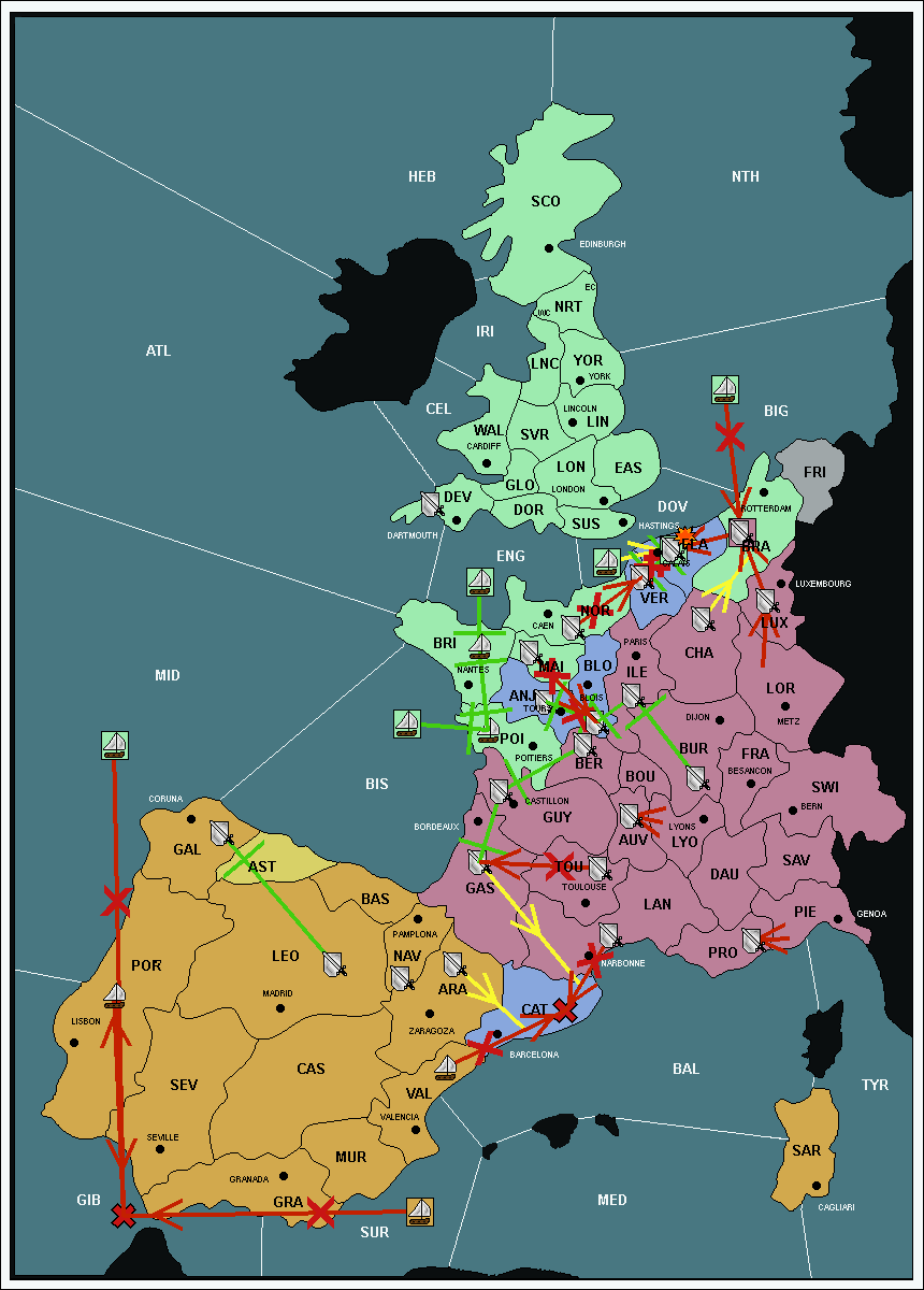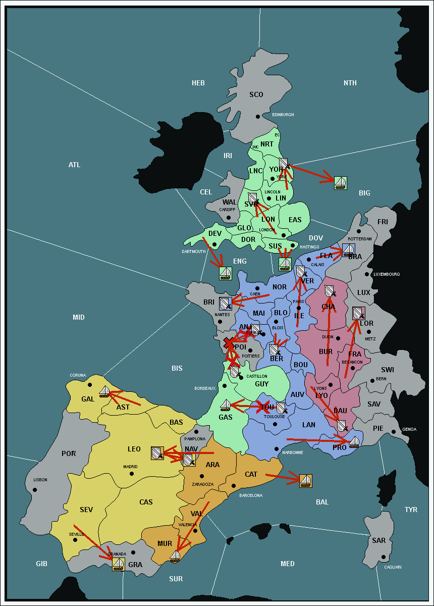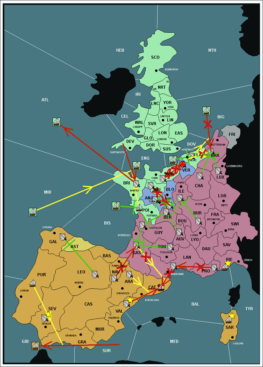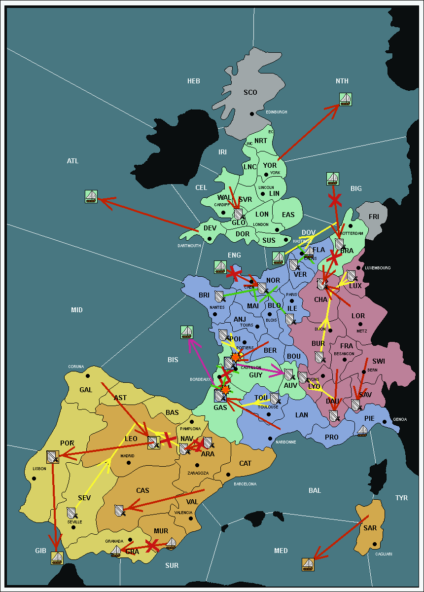 The fleet at Mid-Atlantic (MID) support move to Bay of Biscay (BIS) from Galicia (GAL).