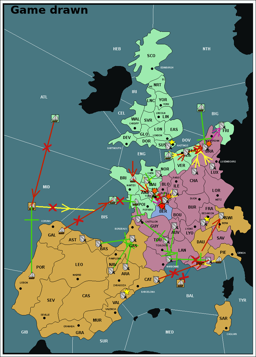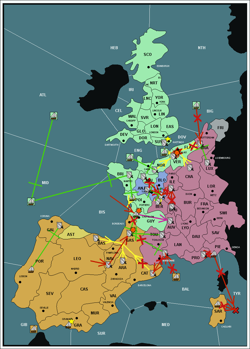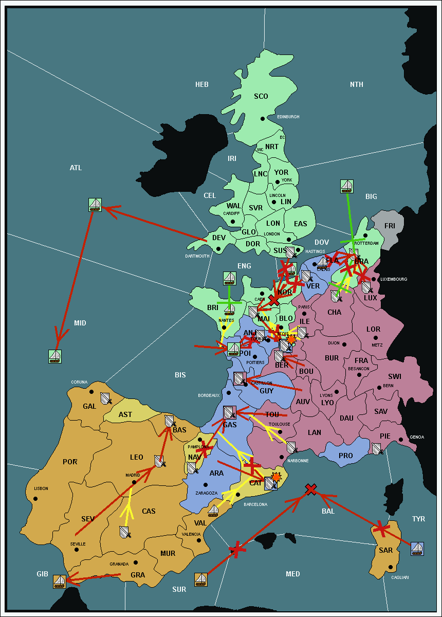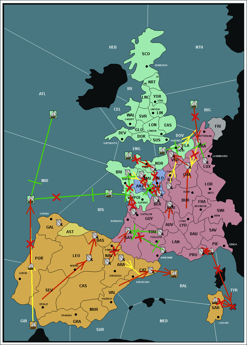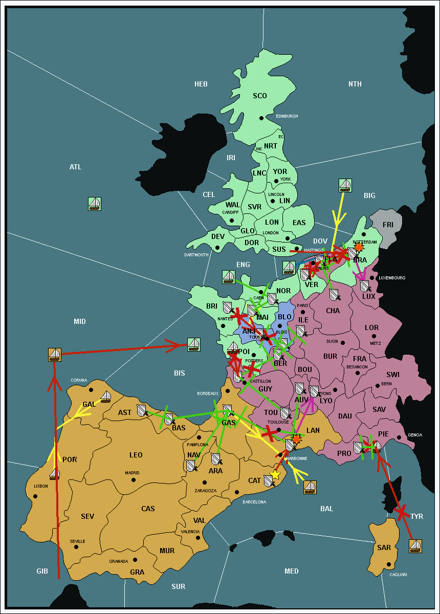 The fleet at Mid-Atlantic (MID) support move to Bay of Biscay (BIS) from Galicia (GAL).
