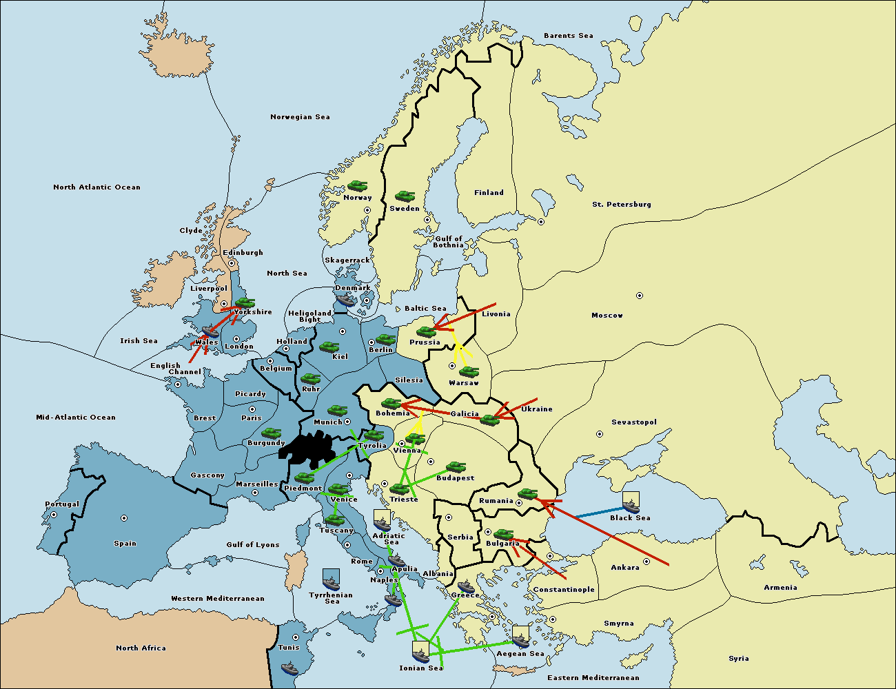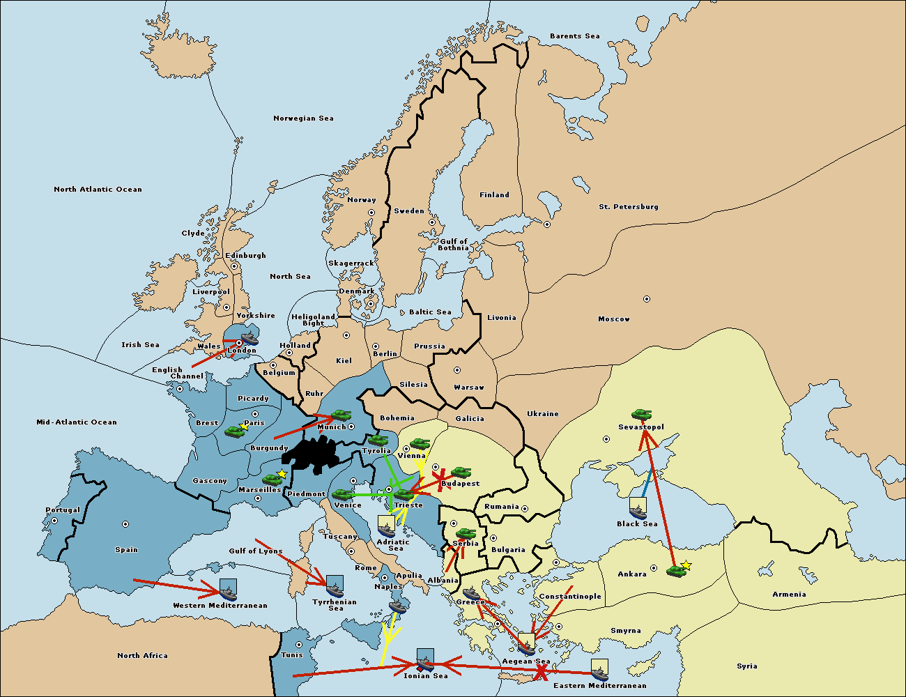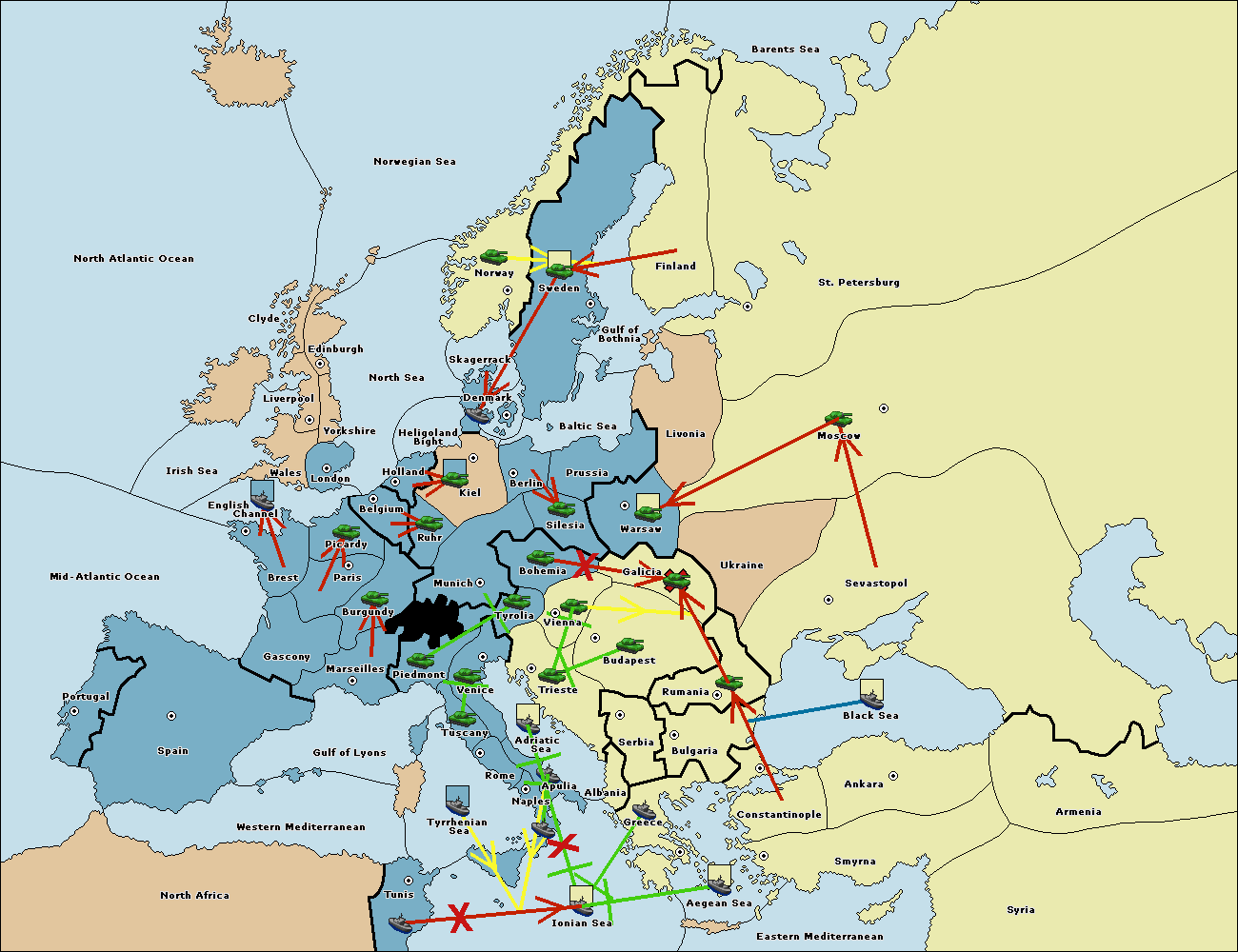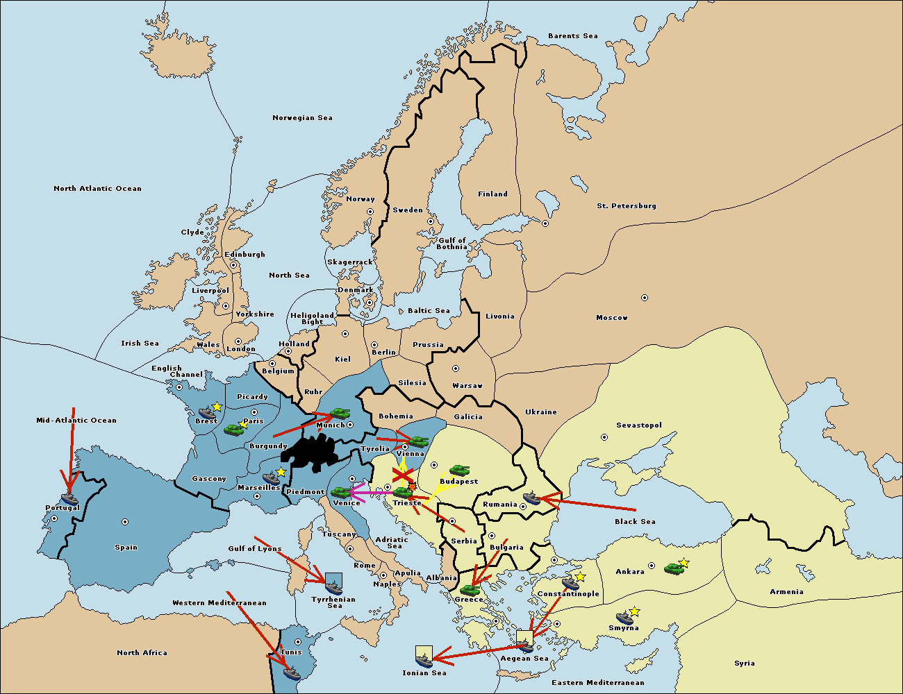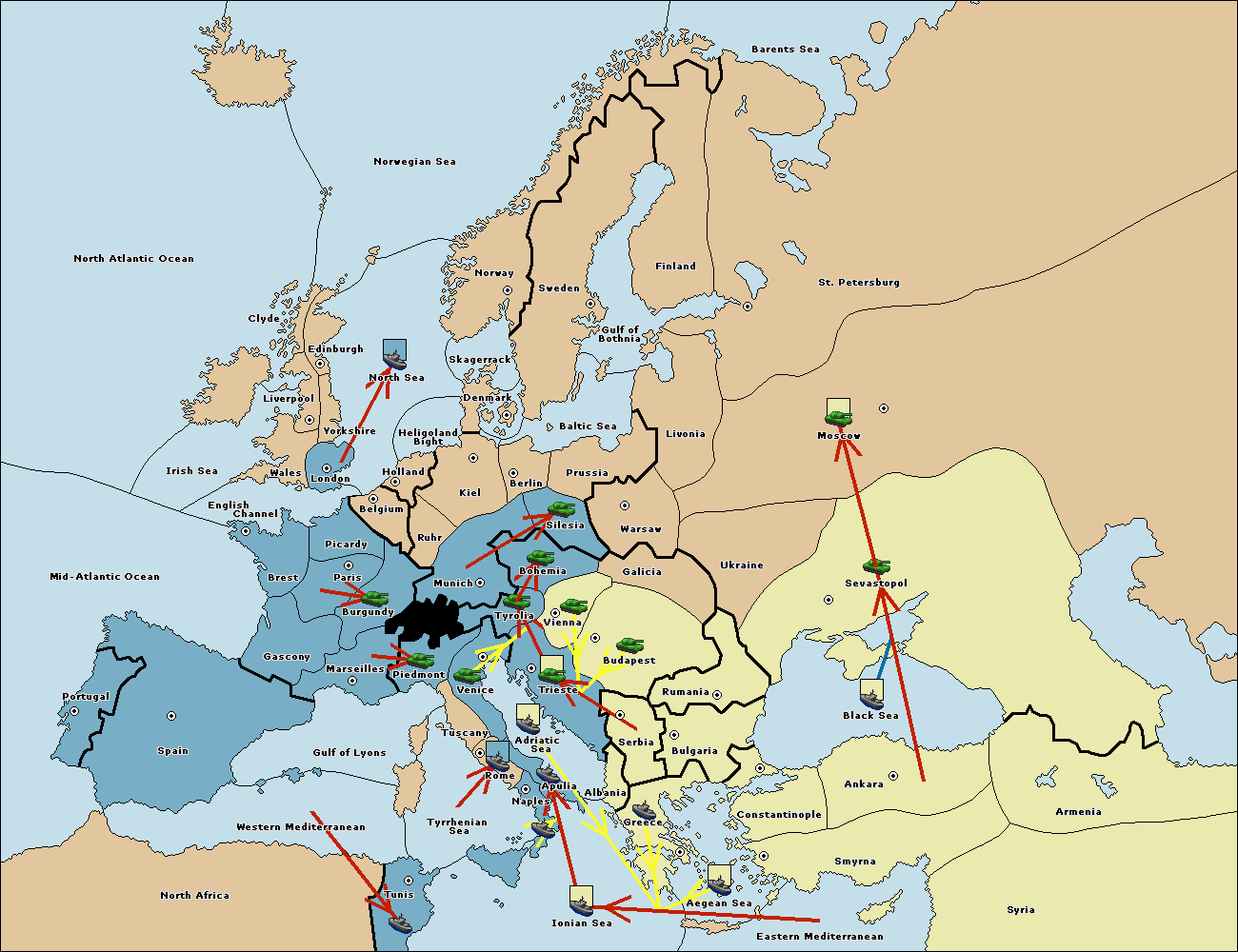 The army at Trieste support move to Tyrolia from Bohemia.