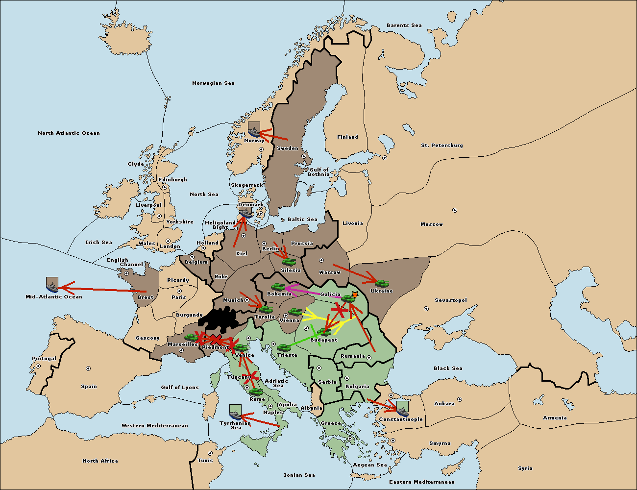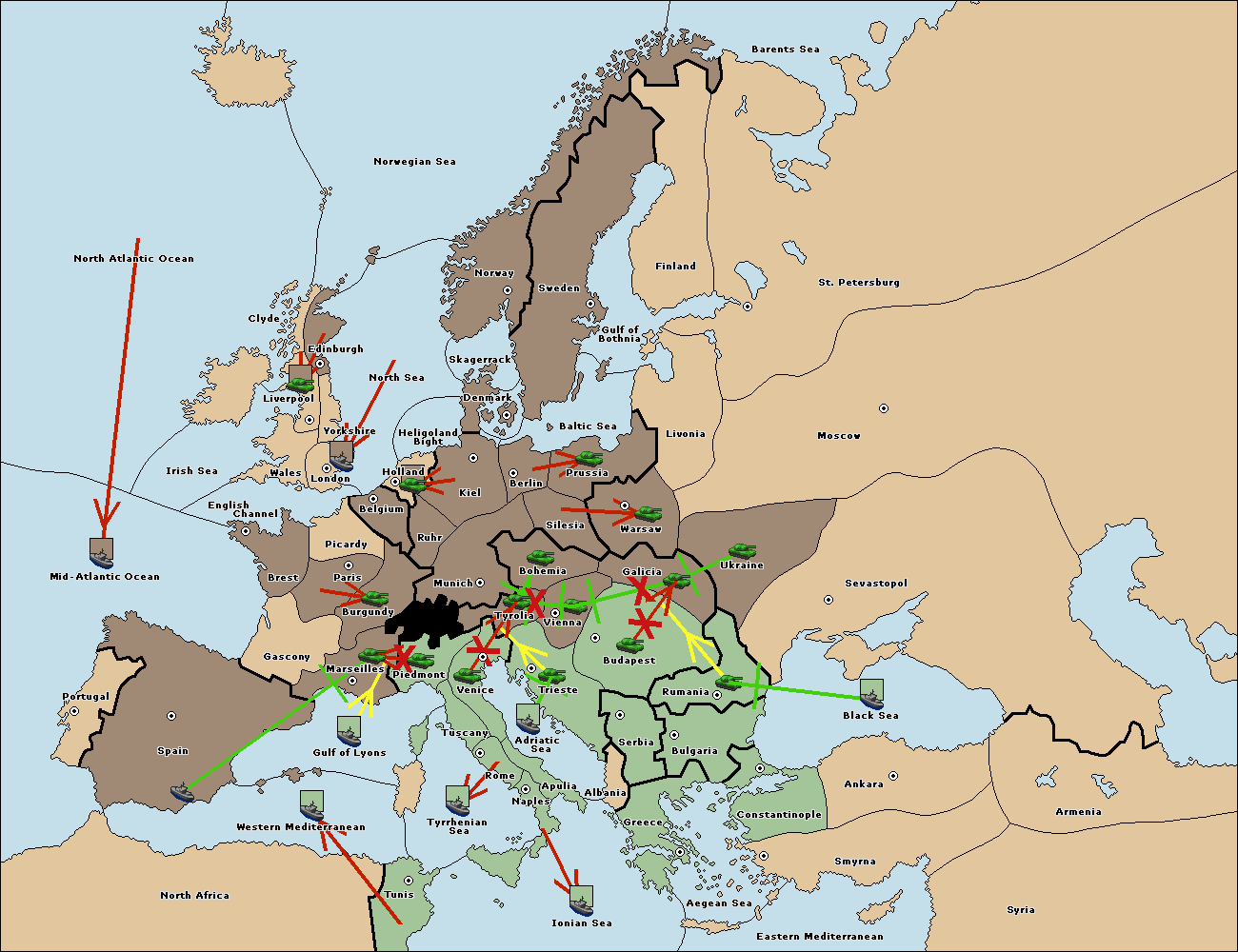 The army at Tyrolia support move to Piedmont from Marseilles.