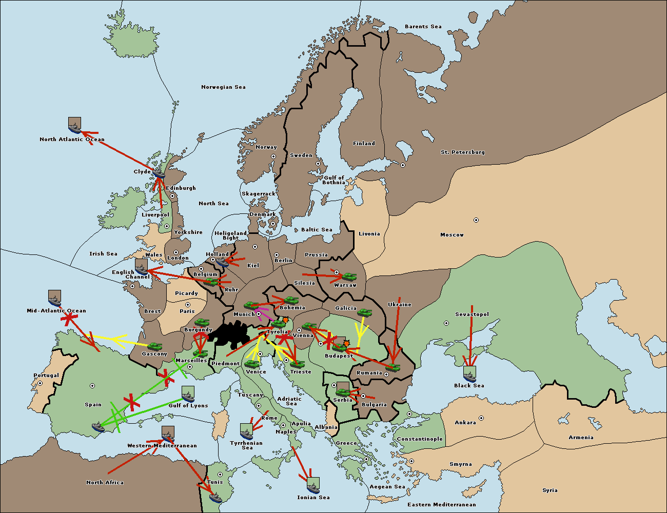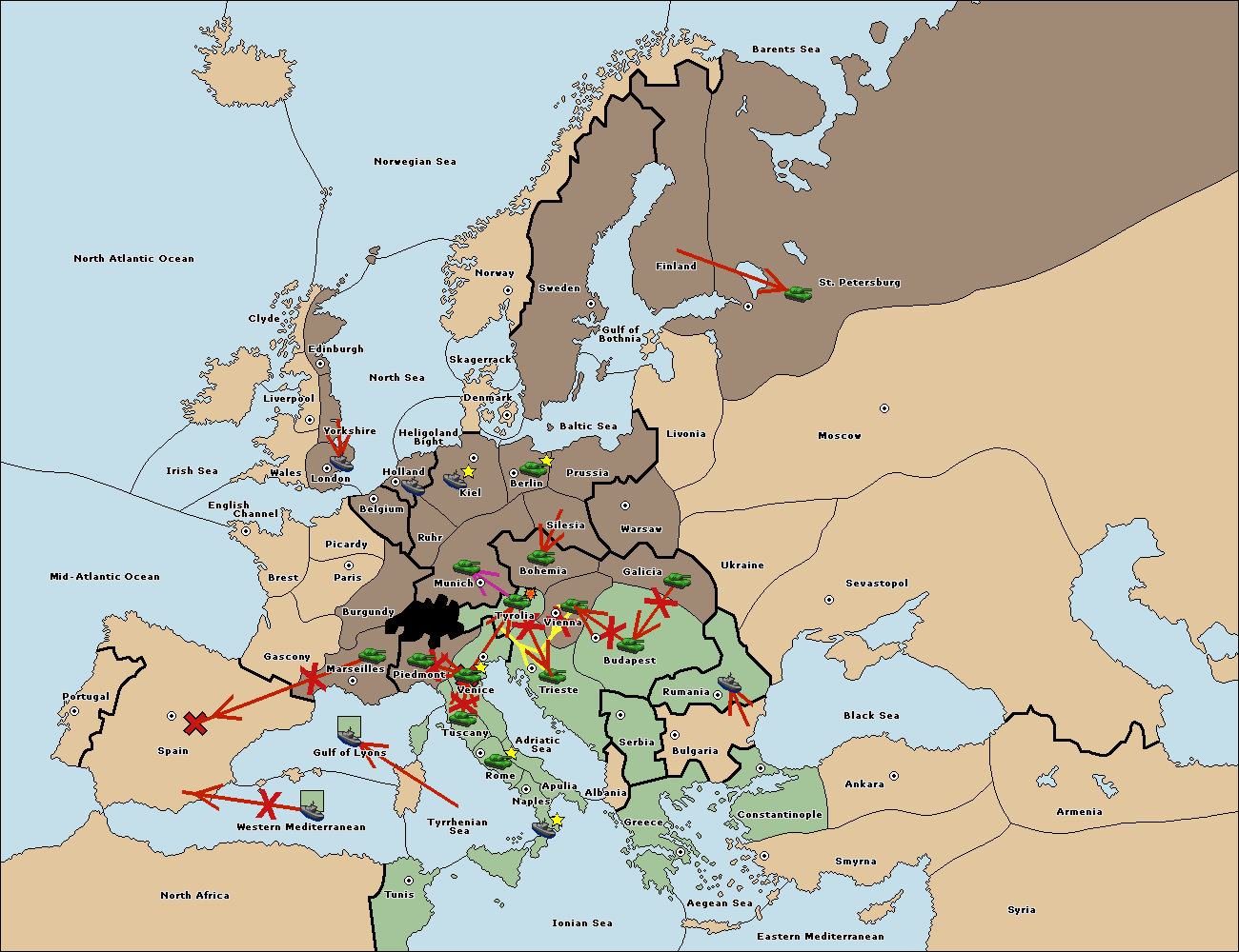 The fleet at Spain (South Coast) support move to Marseilles from Tuscany.
