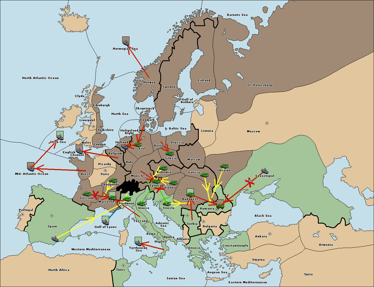 The army at Munich support move to Tyrolia from Piedmont.