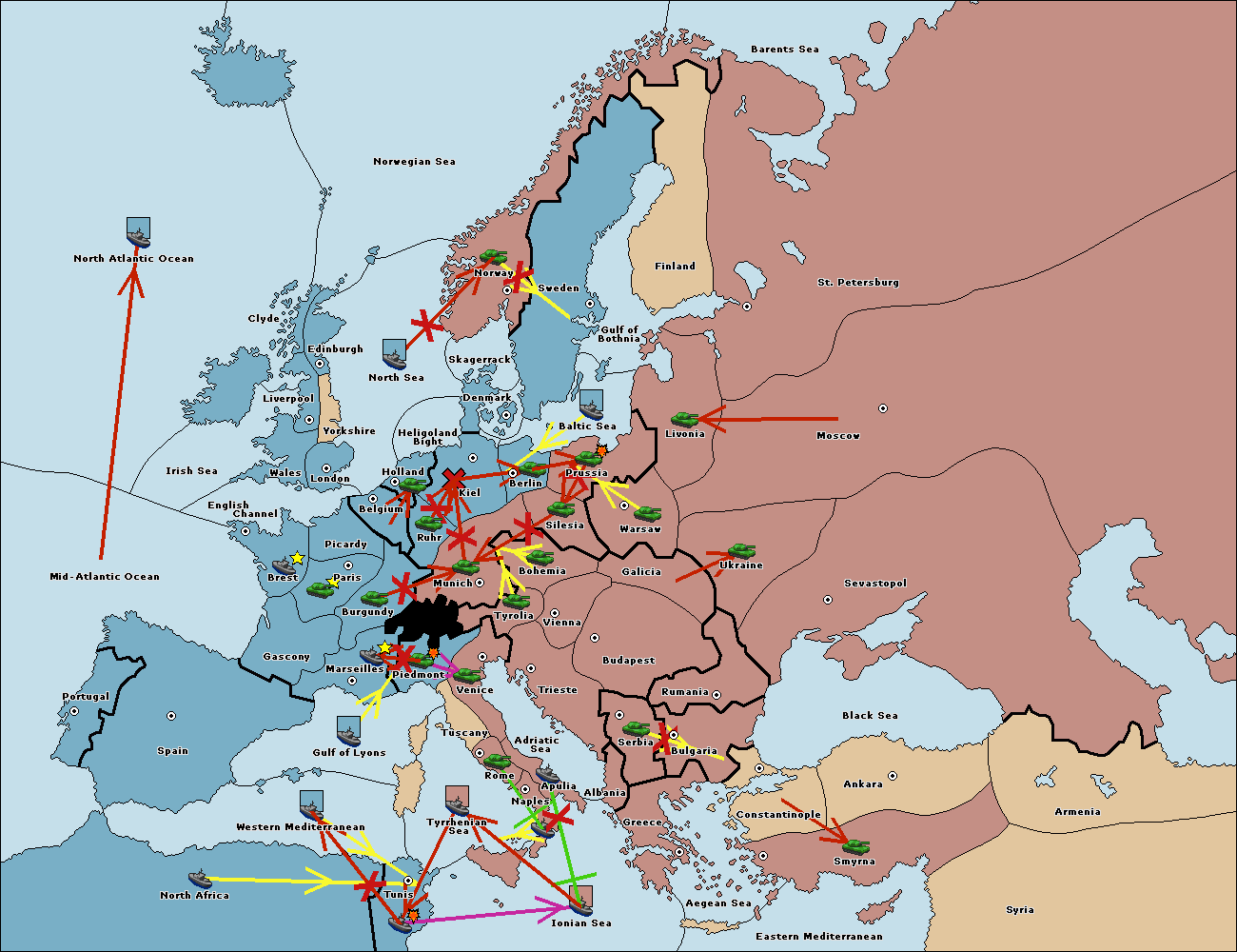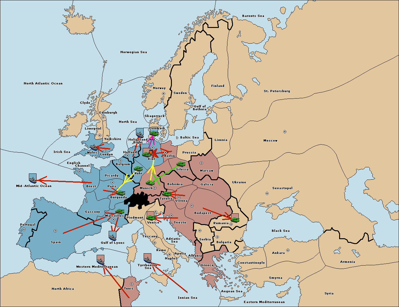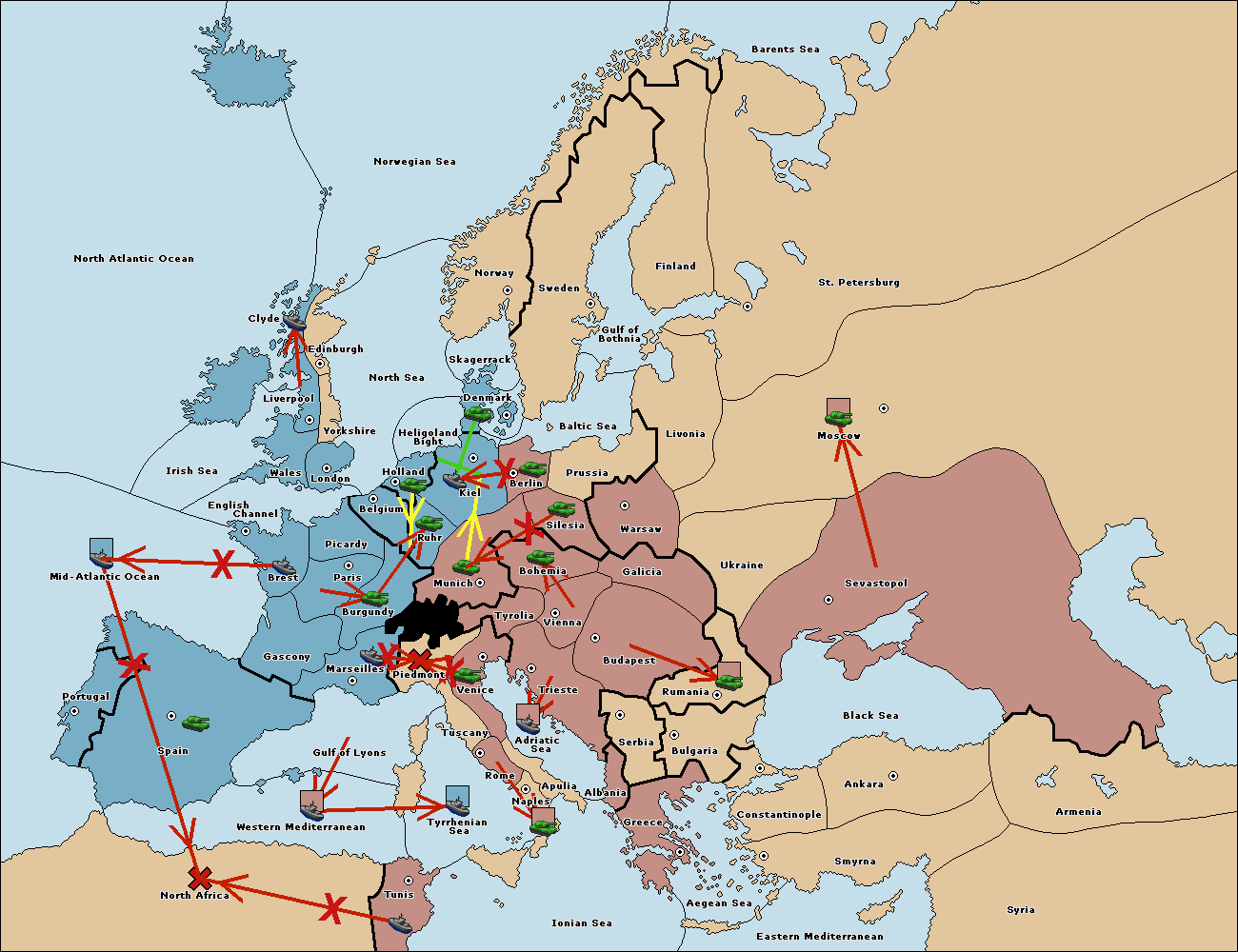 The fleet at Mid-Atlantic Ocean support move to Western Mediterranean from Gulf of Lyons.