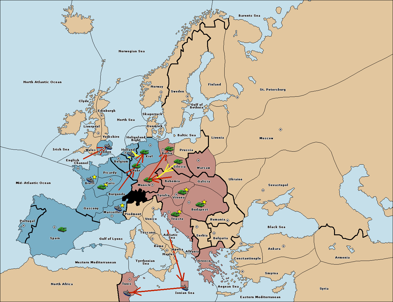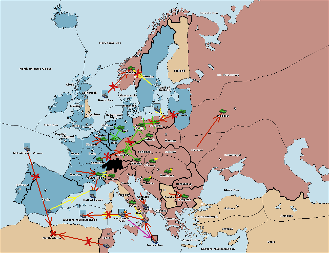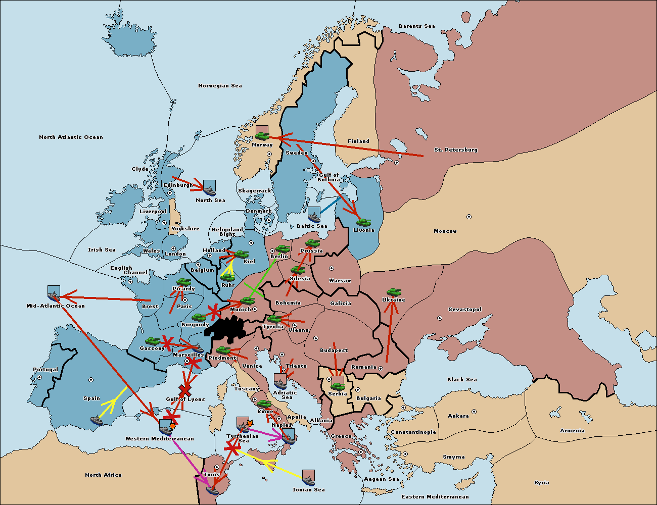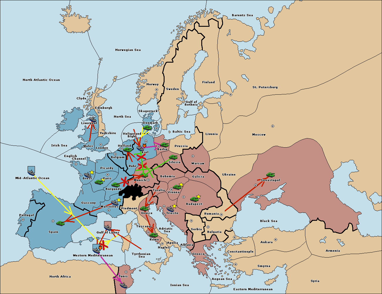 The fleet at Mid-Atlantic Ocean support move to Western Mediterranean from Gulf of Lyons.