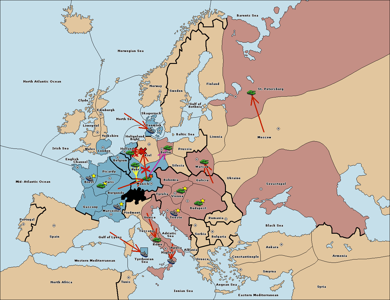 The fleet at Gulf of Lyons move to Tyrrhenian Sea.