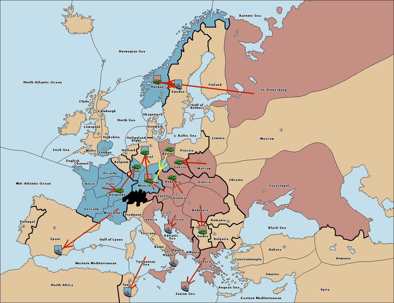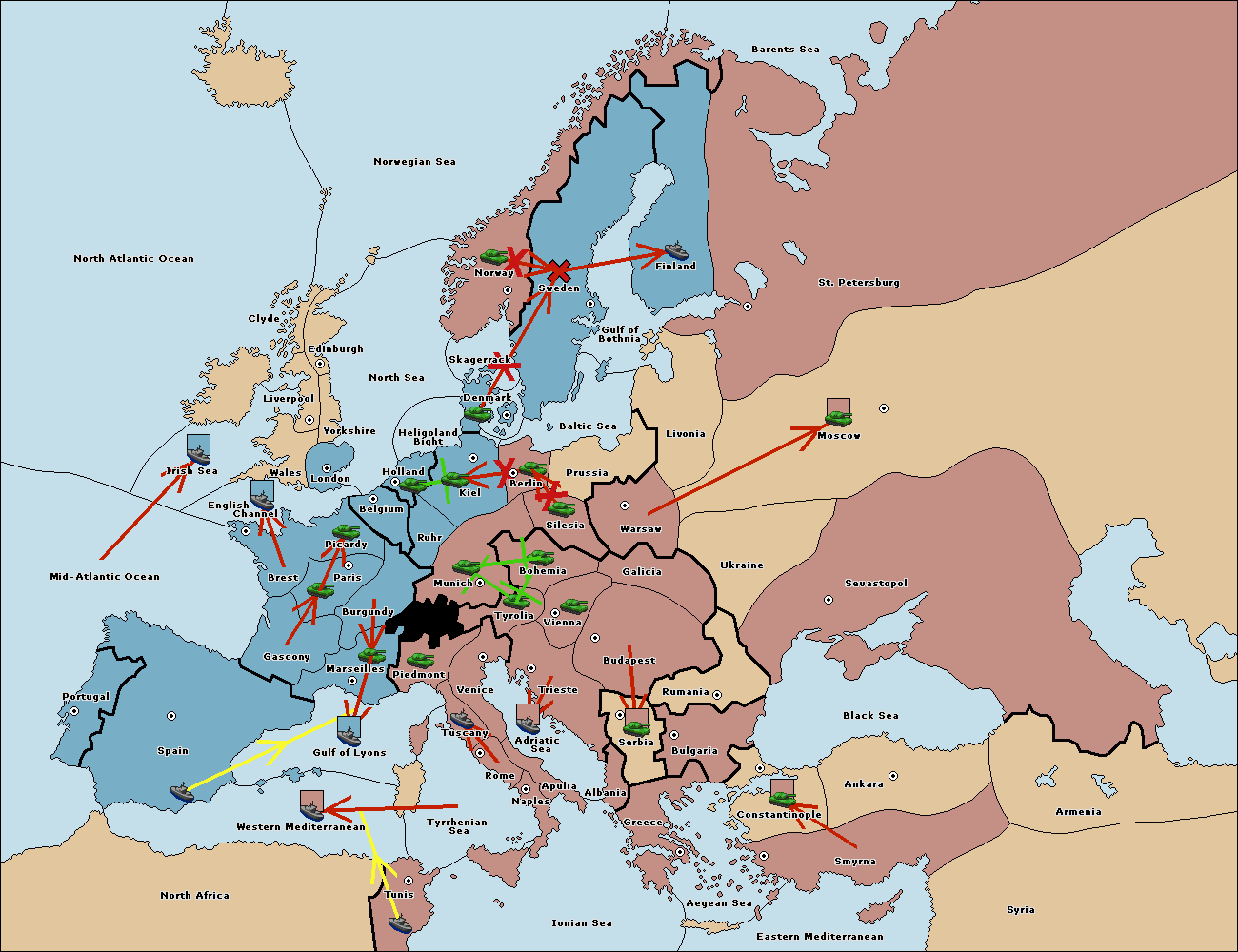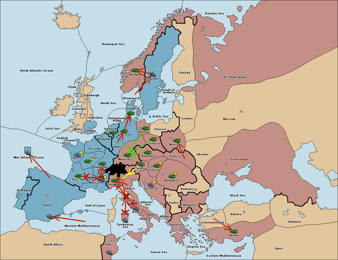 The fleet at Spain (South Coast) support move to Gulf of Lyons from Marseilles.