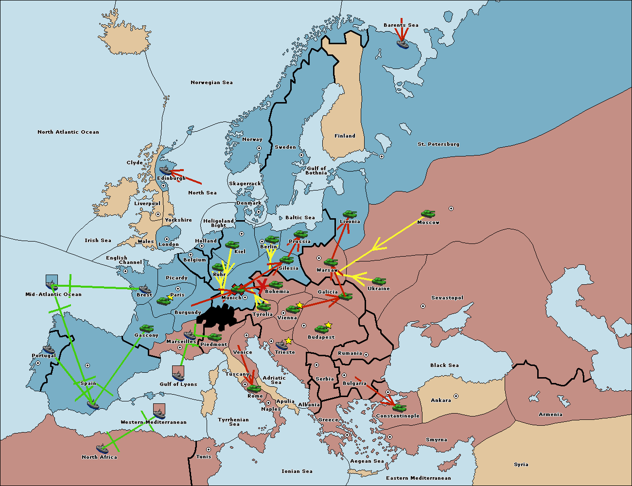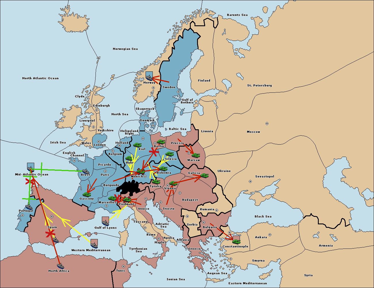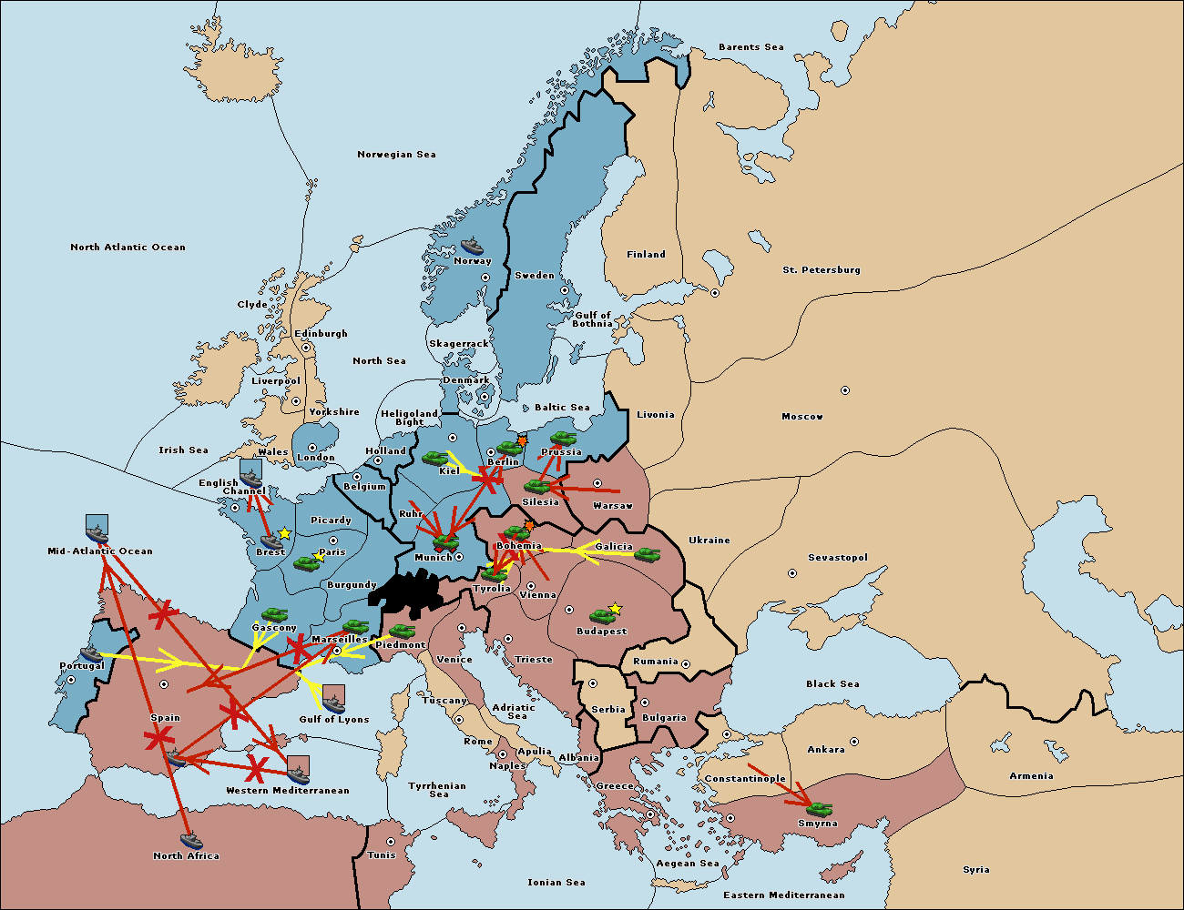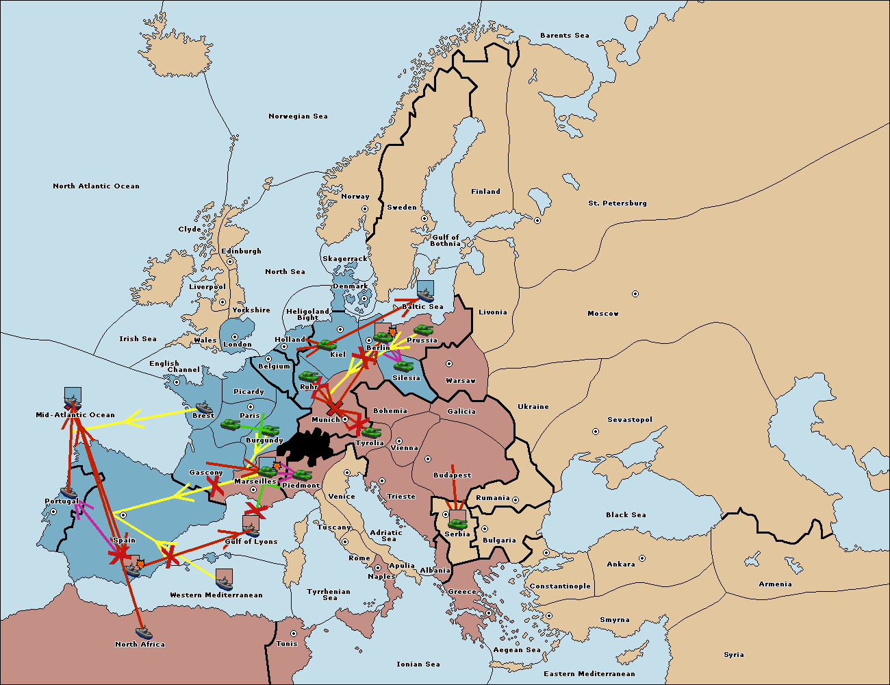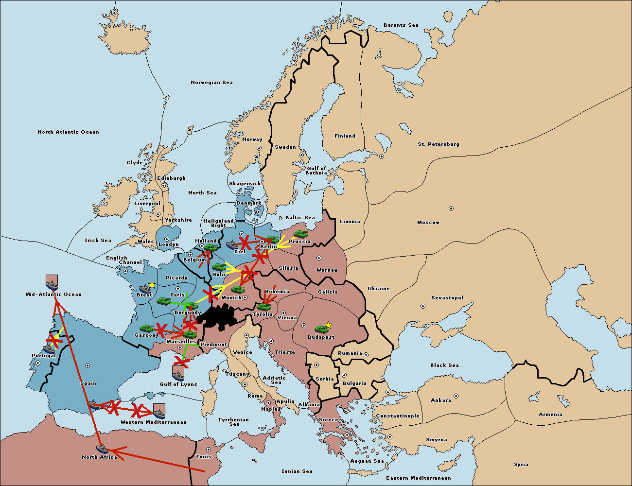 The fleet at North Africa move to Mid-Atlantic Ocean.