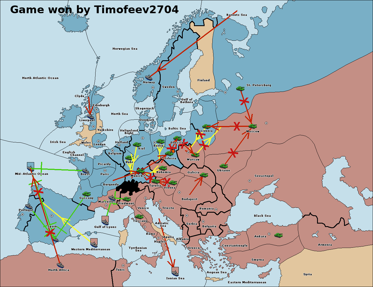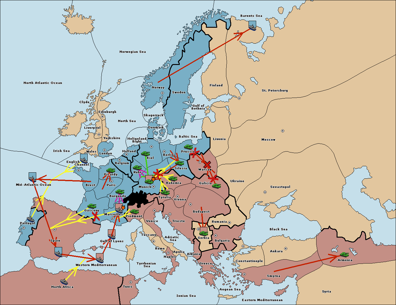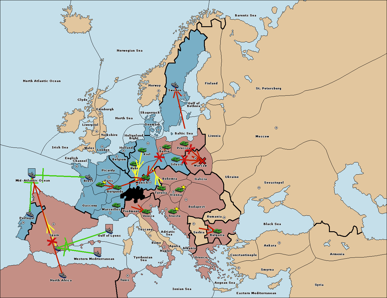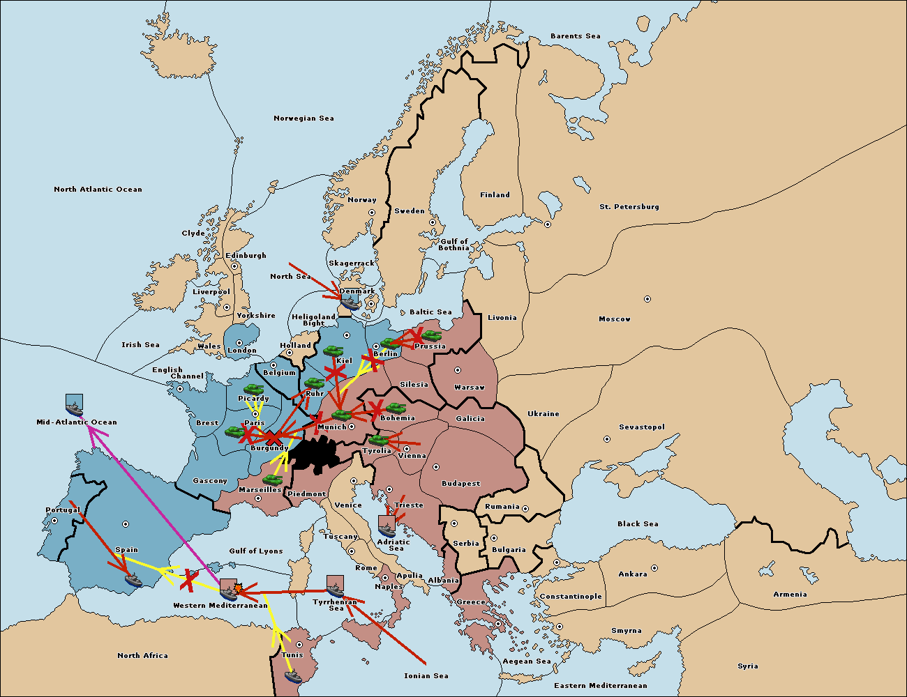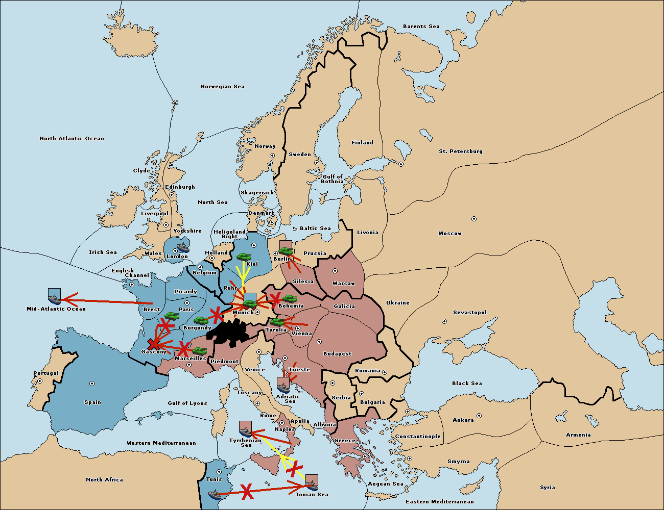 The fleet at Tyrrhenian Sea support move to Tunis from Ionian Sea.