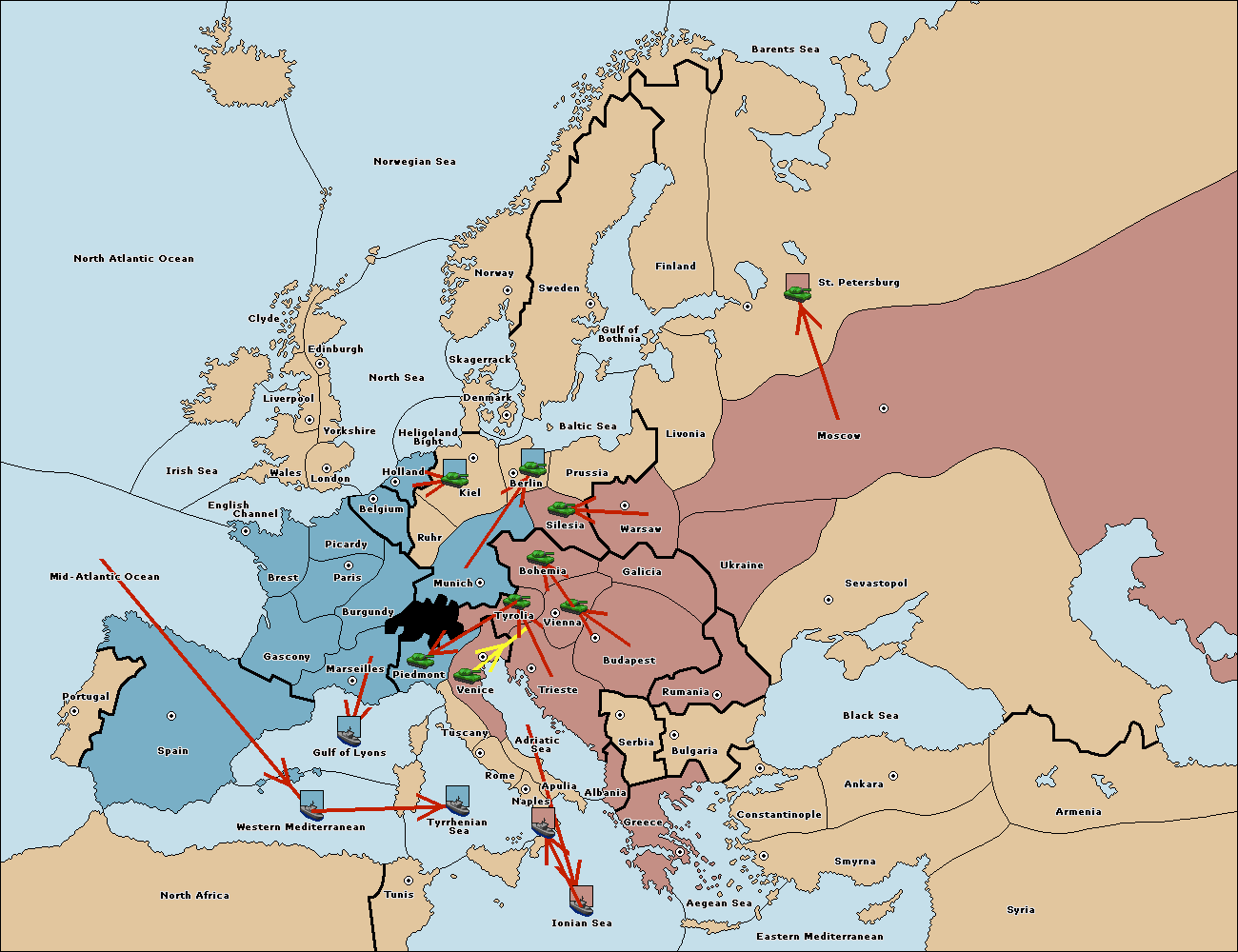 The army at Venice support move to Tyrolia from Trieste.