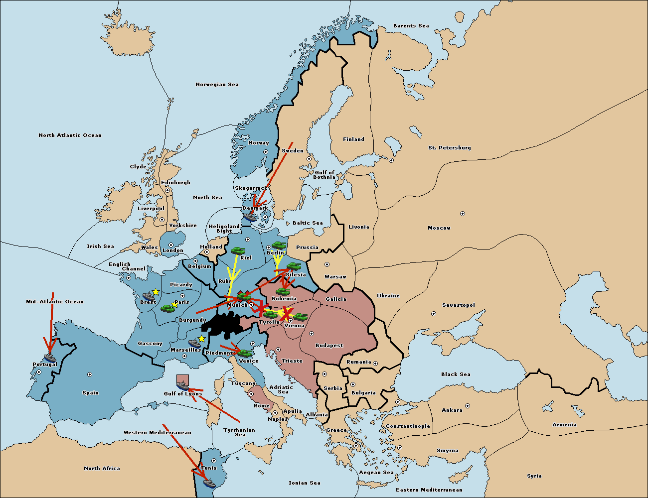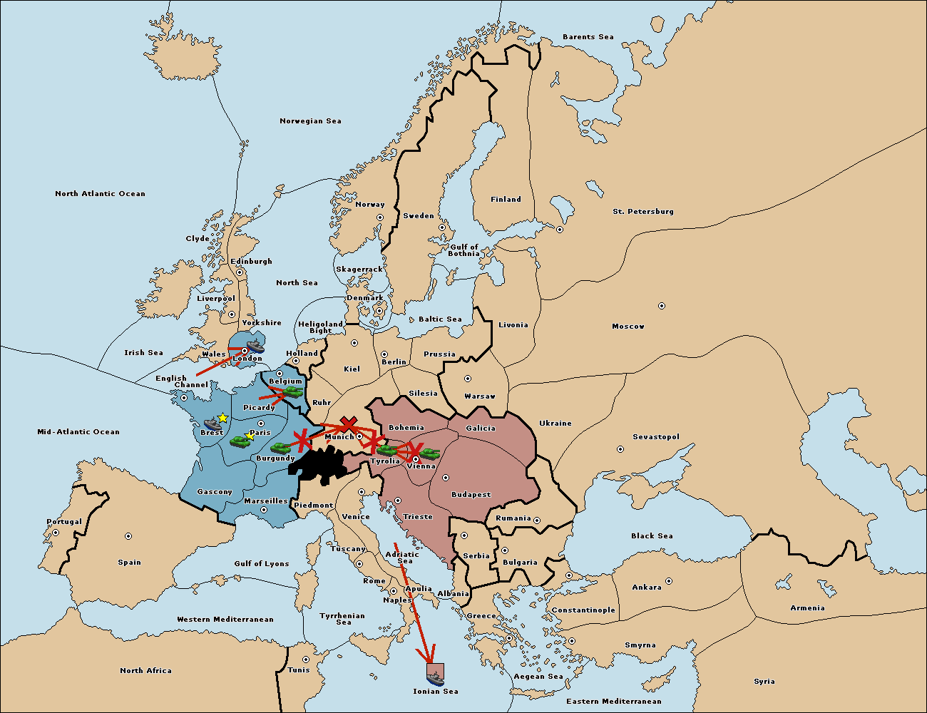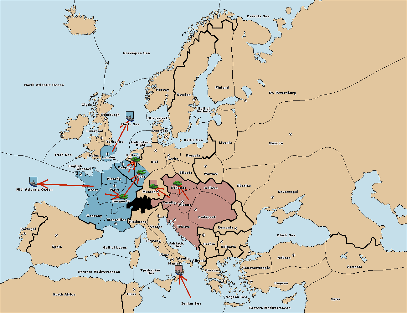 The fleet at Mid-Atlantic Ocean move to Western Mediterranean.