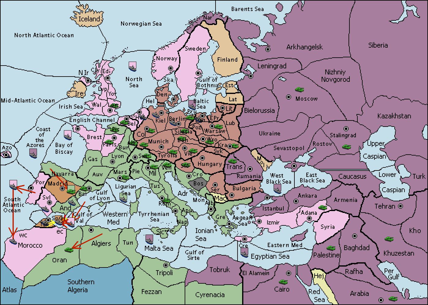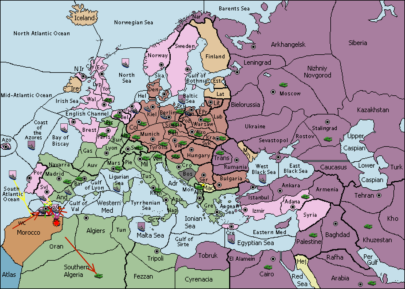 The fleet at Straights of Gibraltar retreat to Morocco (East Coast).