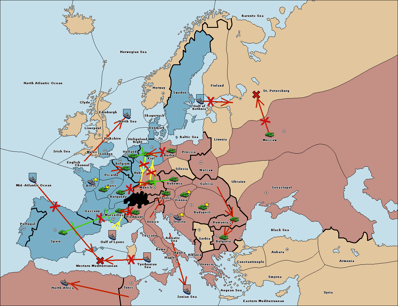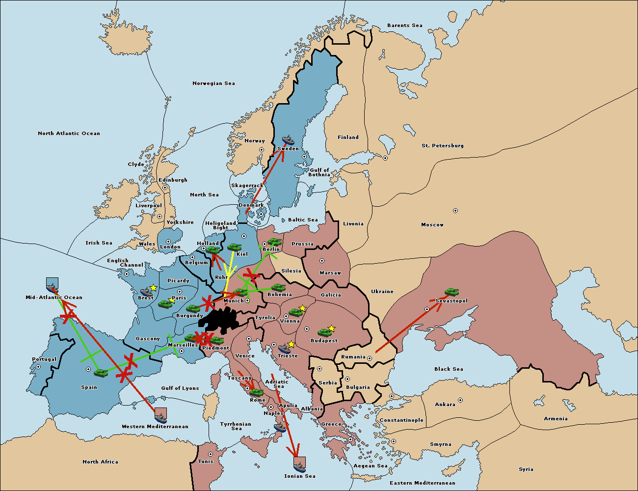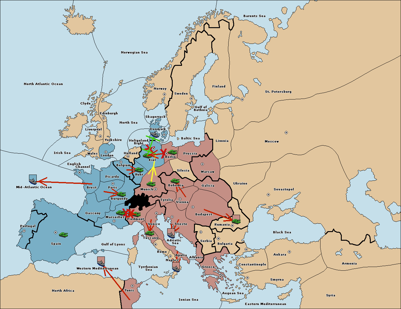 The fleet at Mid-Atlantic Ocean move to Western Mediterranean.