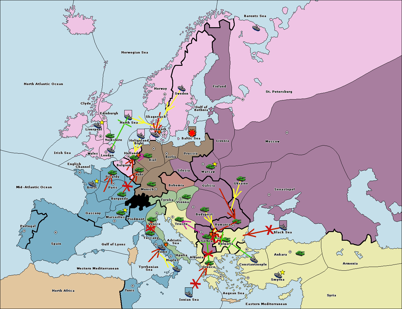 The fleet at Rumania support move to Bulgaria from Constantinople.