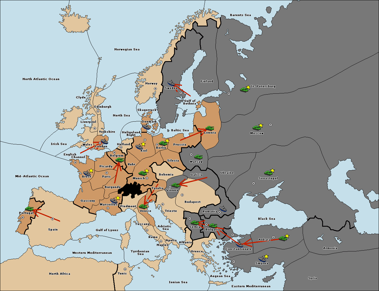 The fleet at Livonia move to St. Petersburg (South Coast).