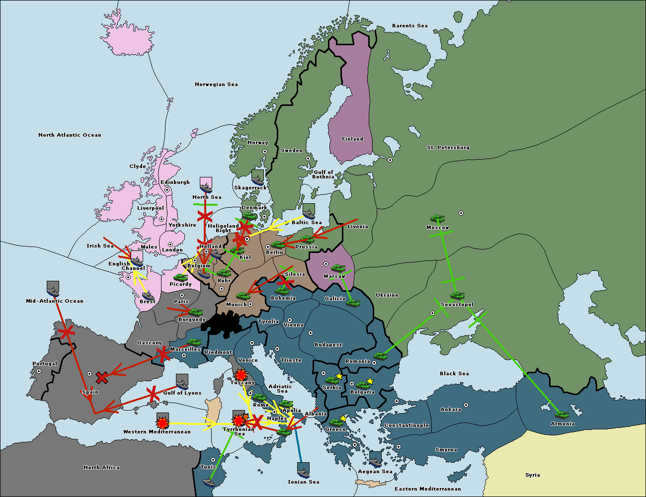 The fleet at Spain (South Coast) support move to Gulf of Lyons from Western Mediterranean.