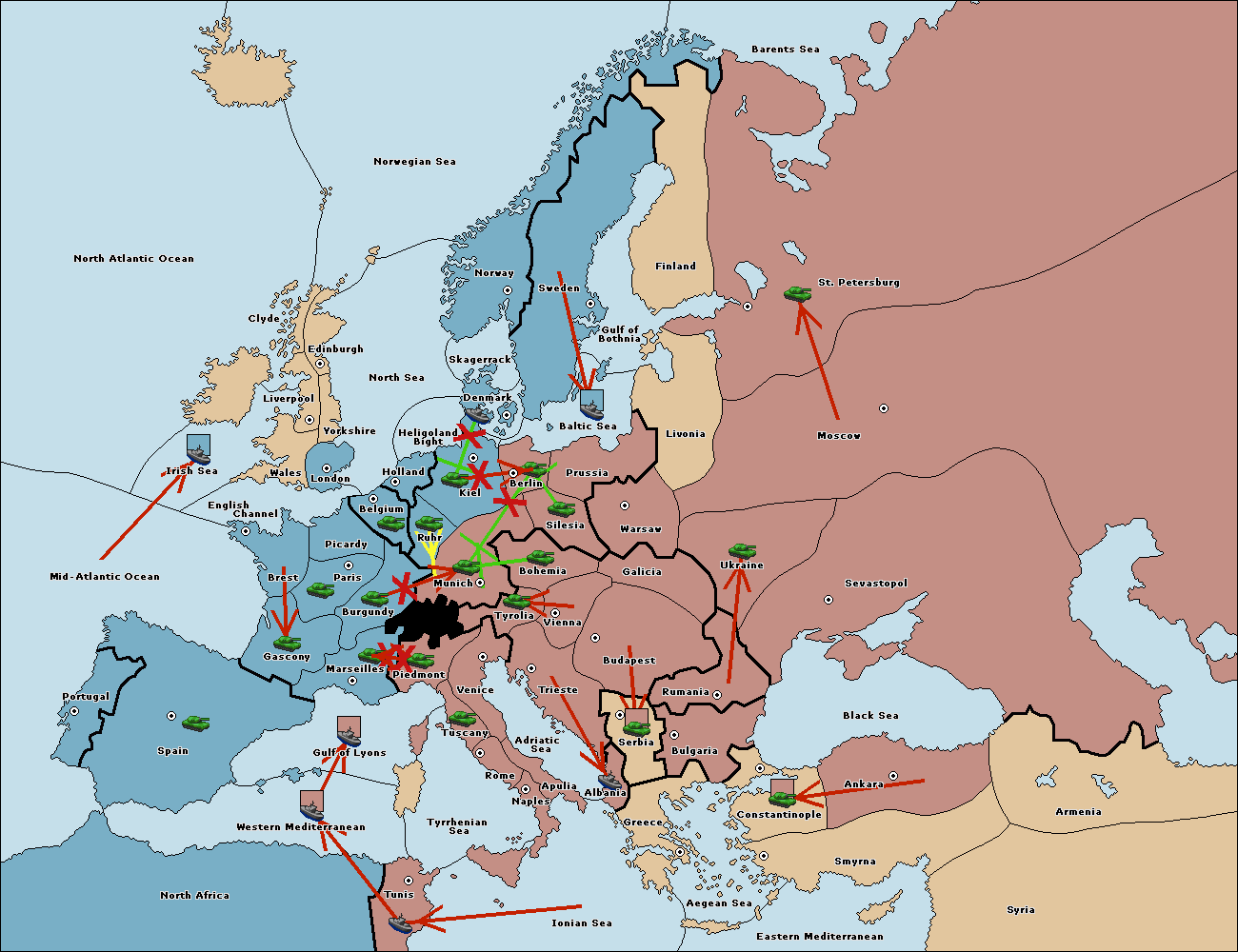 The fleet at Tyrrhenian Sea support move to Tunis from Ionian Sea.