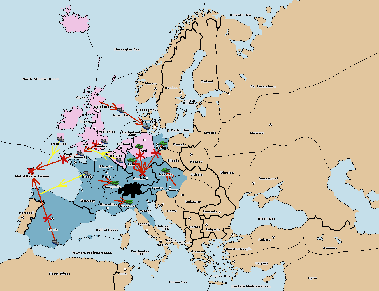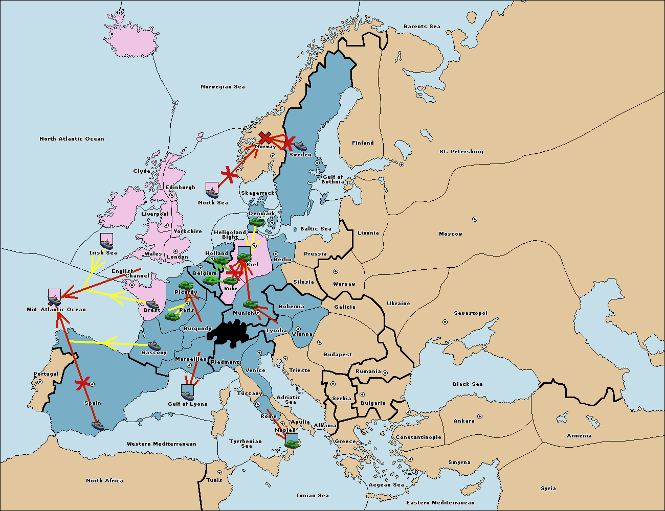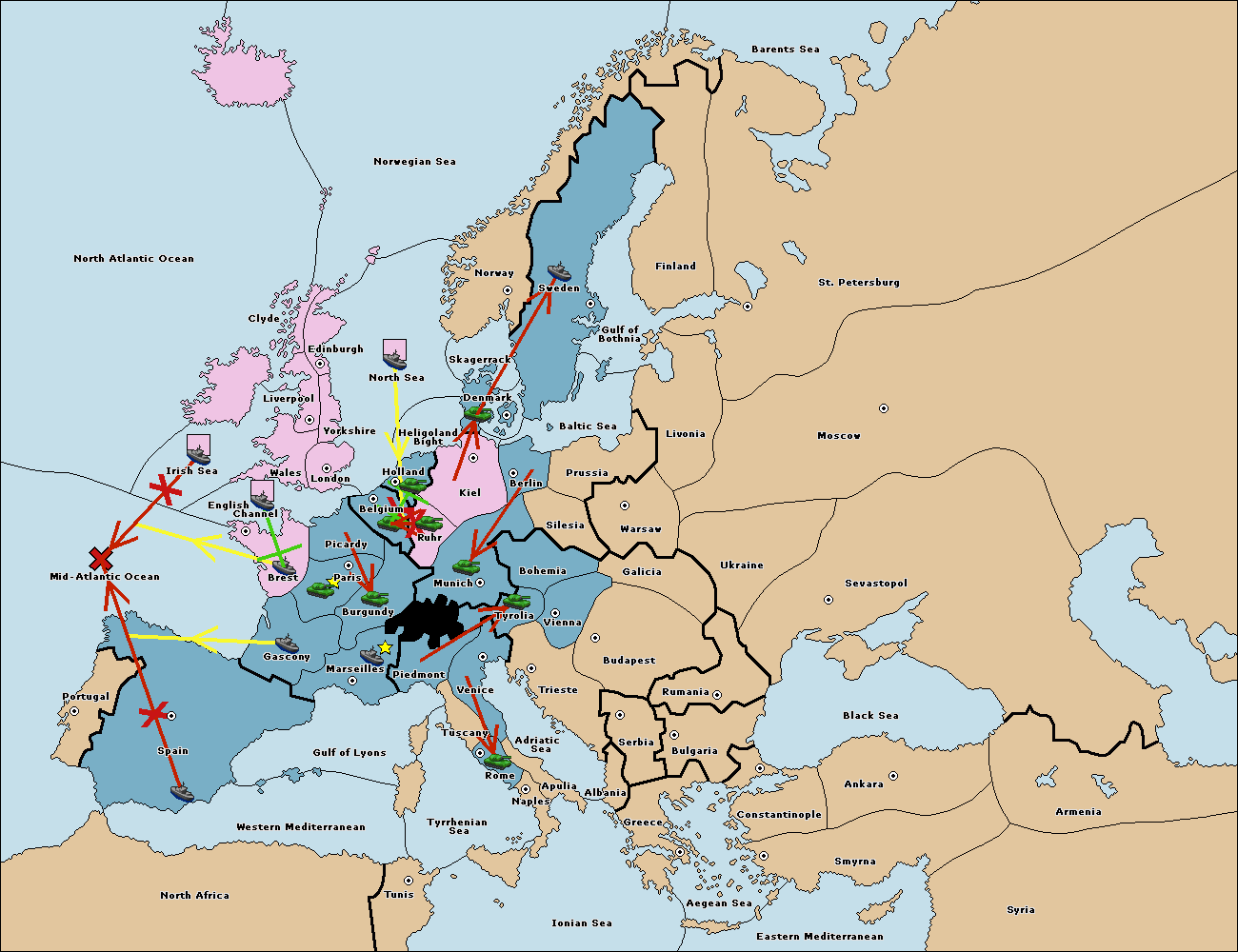The fleet at Mid-Atlantic Ocean support move to English Channel from Brest.