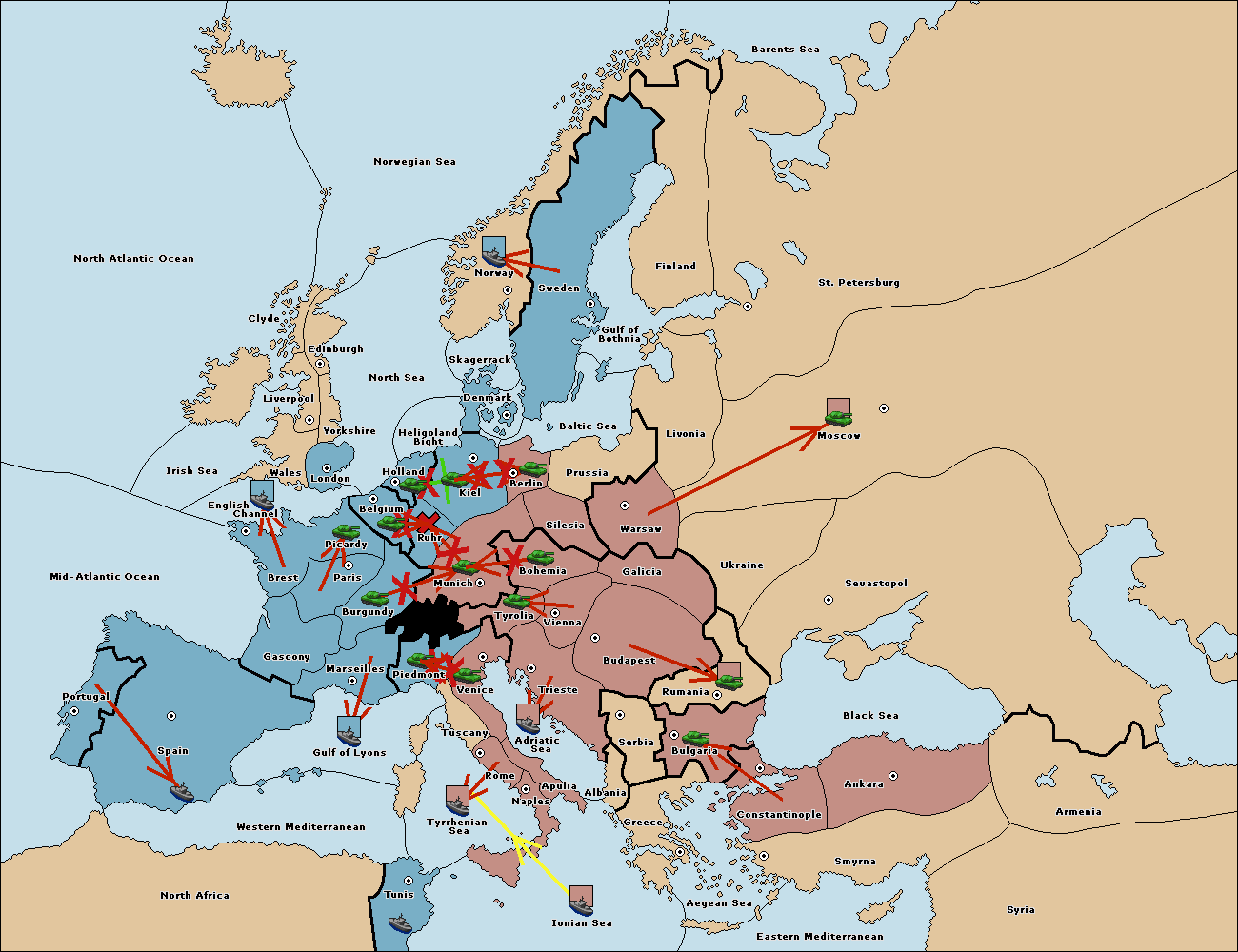 The fleet at Ionian Sea support move to Tyrrhenian Sea from Tunis.