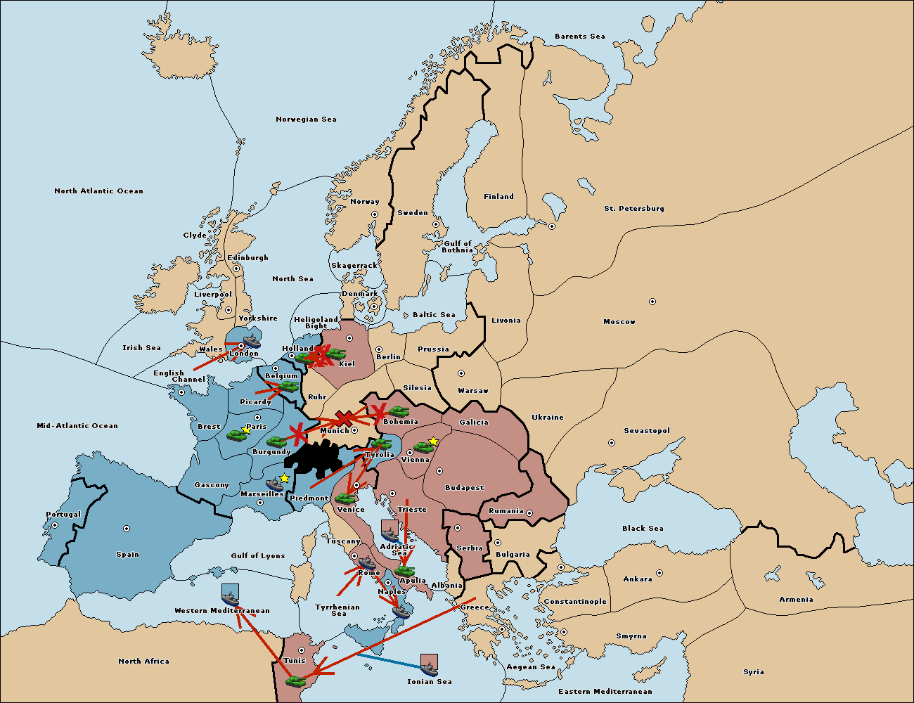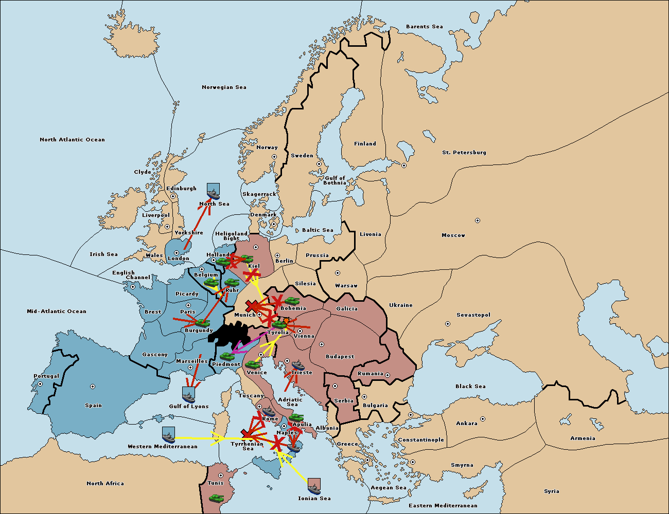 The fleet at Ionian Sea support move to Tyrrhenian Sea from Tunis.