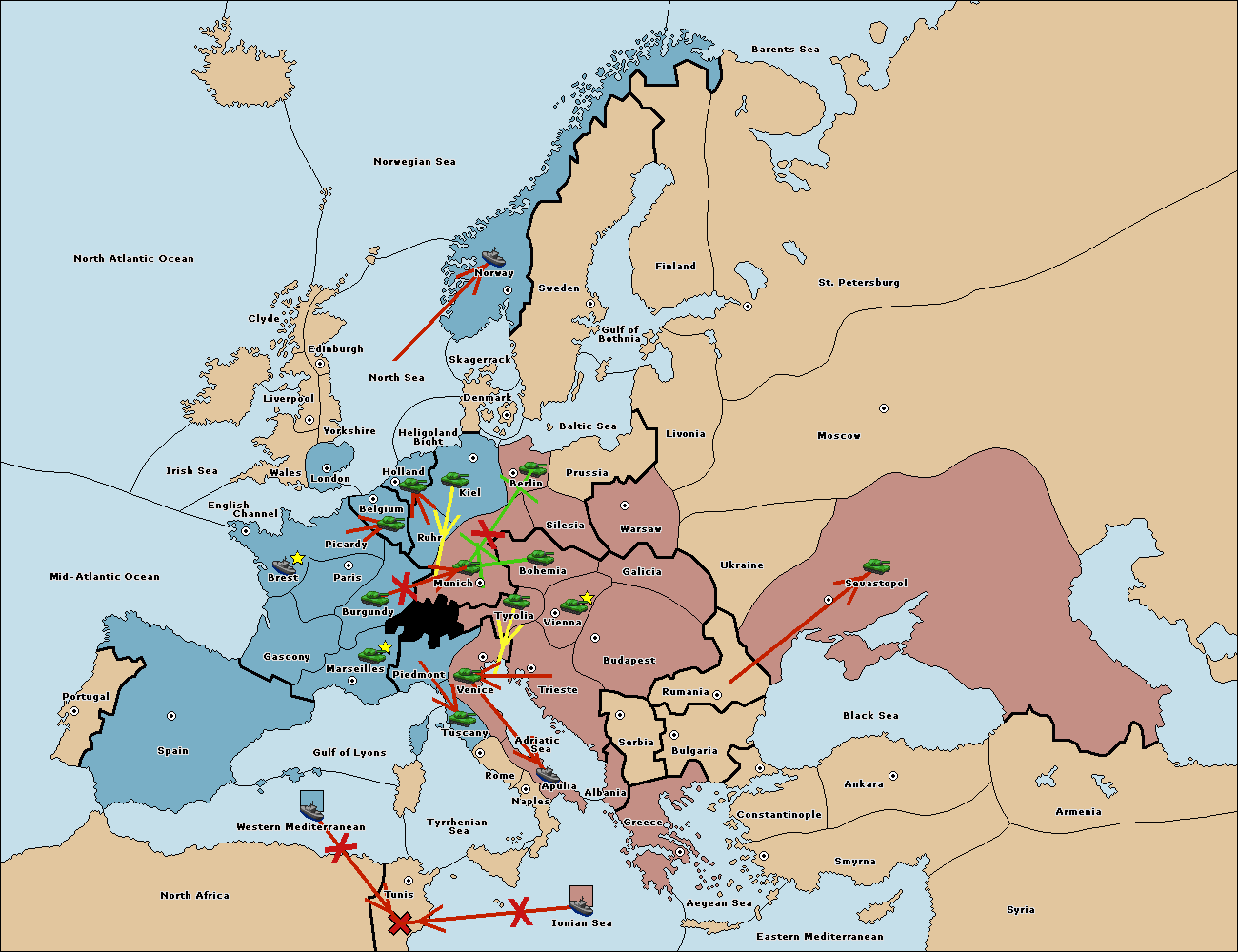 The fleet at Tyrrhenian Sea support move to Tunis from Ionian Sea.
