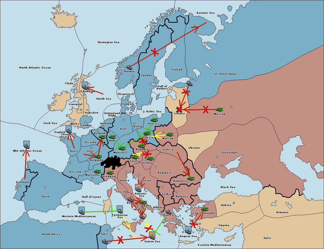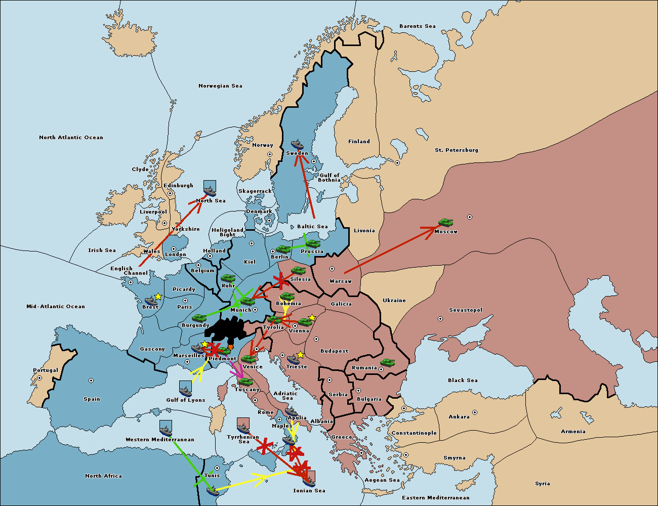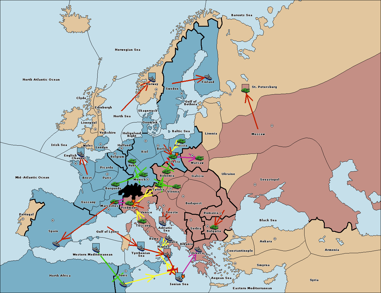 The fleet at Ionian Sea support move to Tyrrhenian Sea from Tunis.