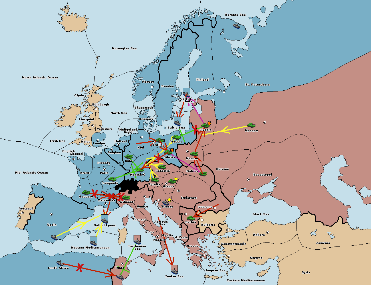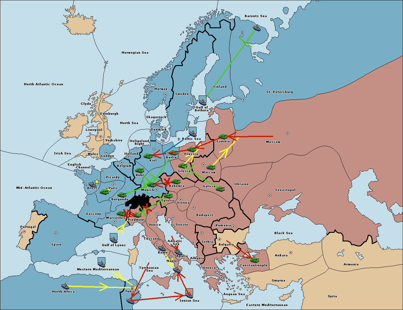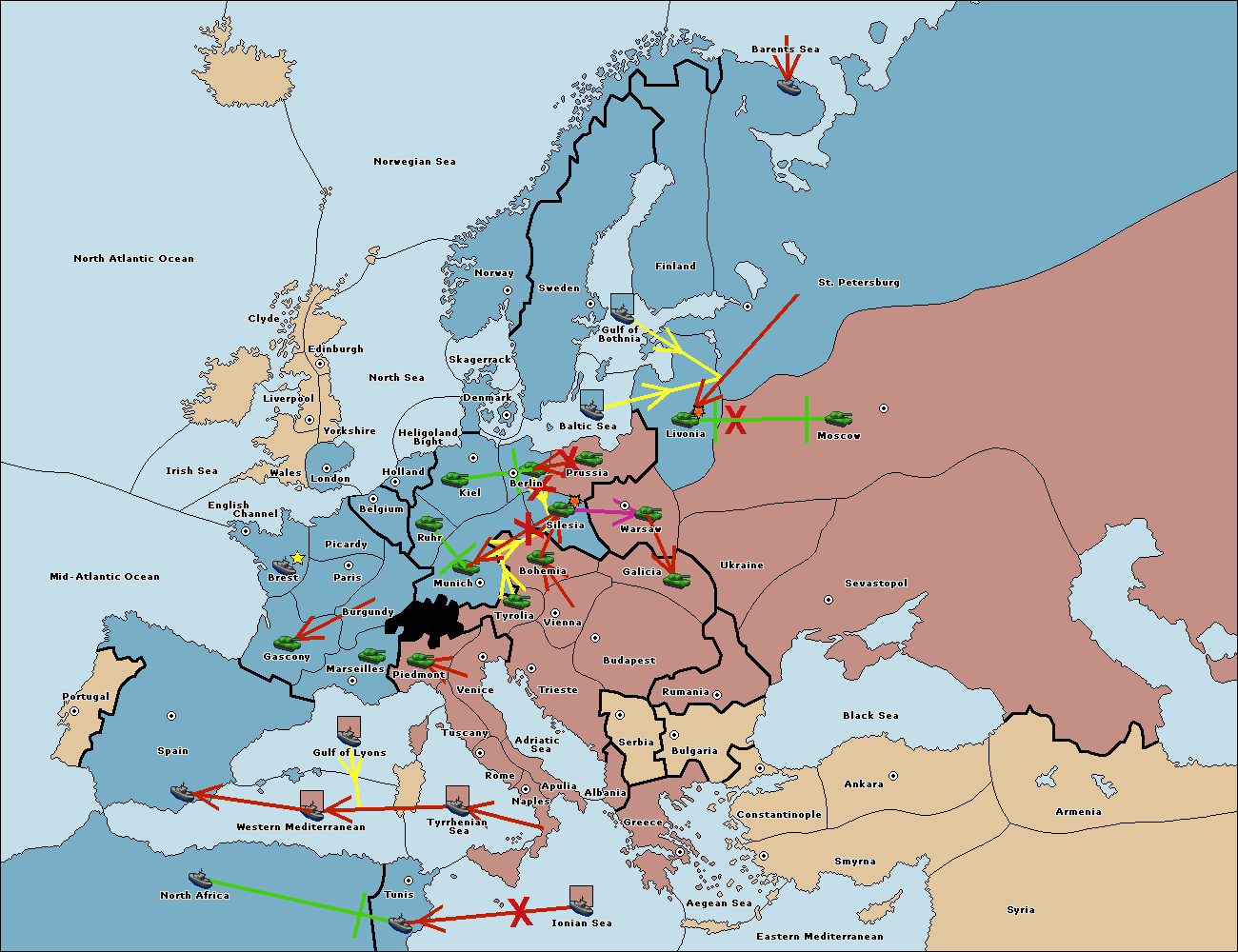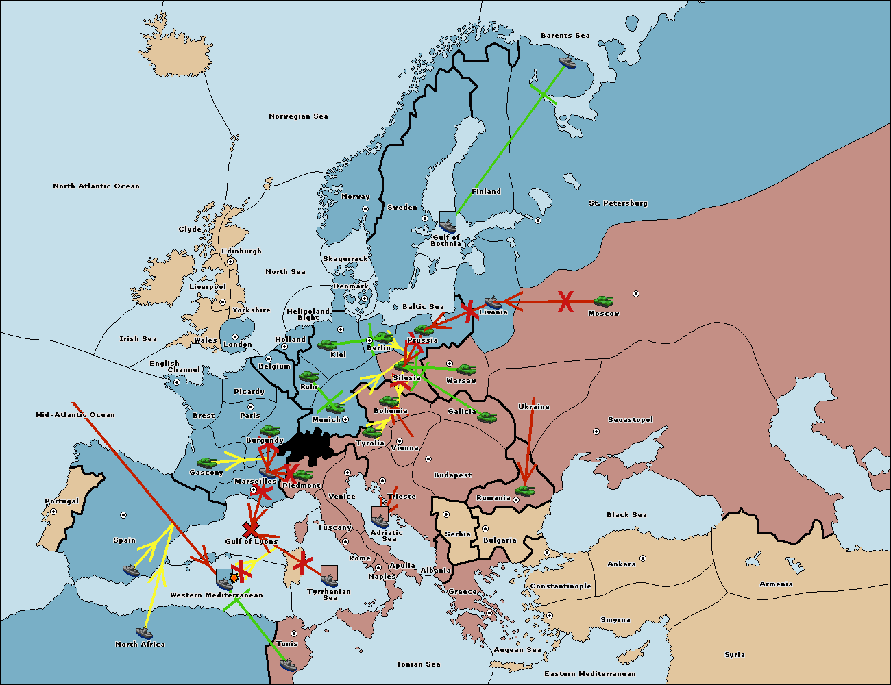 The fleet at Tyrrhenian Sea support move to Gulf of Lyons from Tuscany.