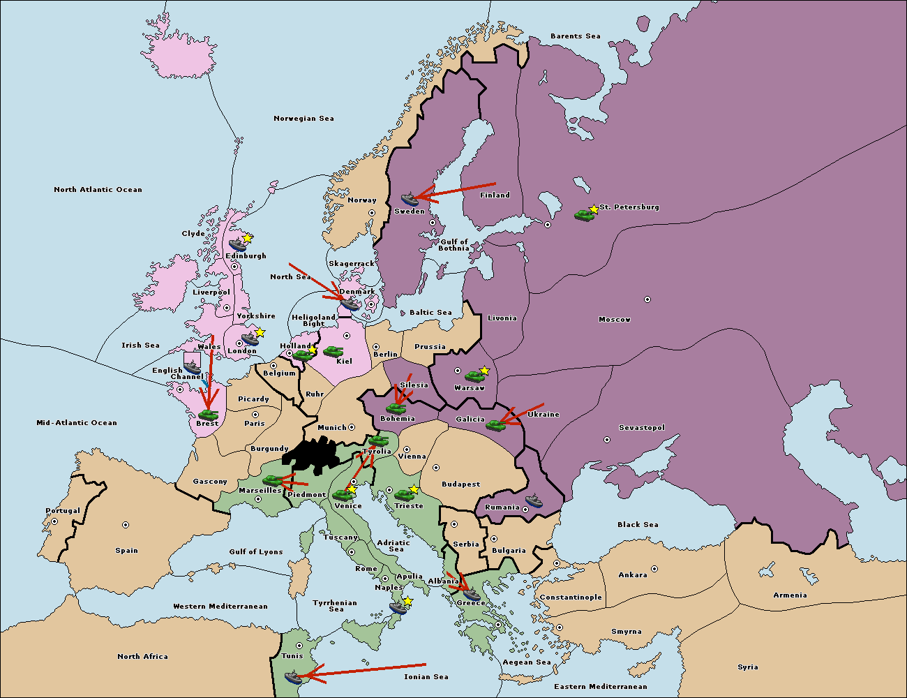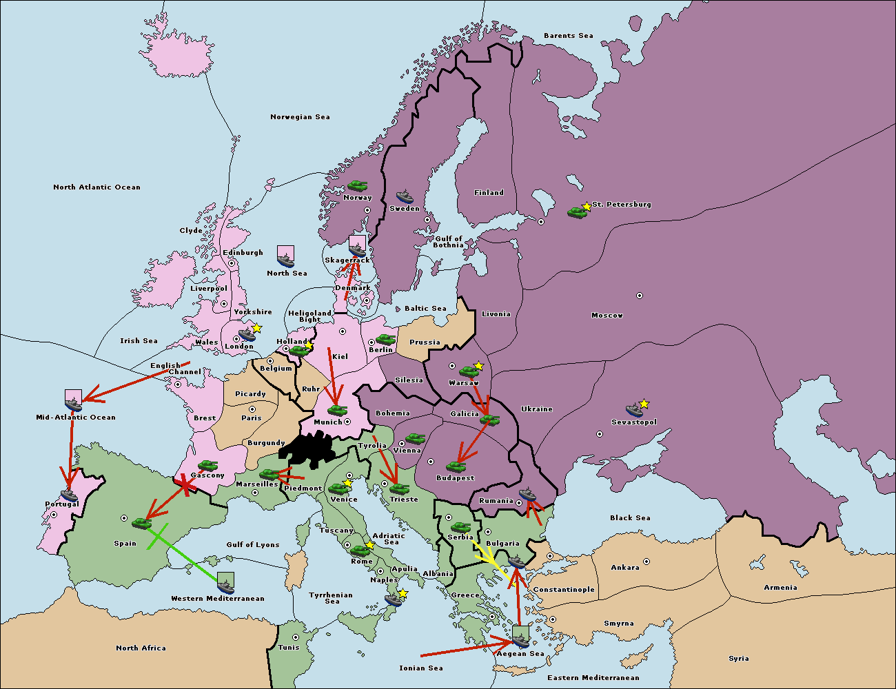 The fleet at Bulgaria (South Coast) support move to Constantinople from Aegean Sea.
