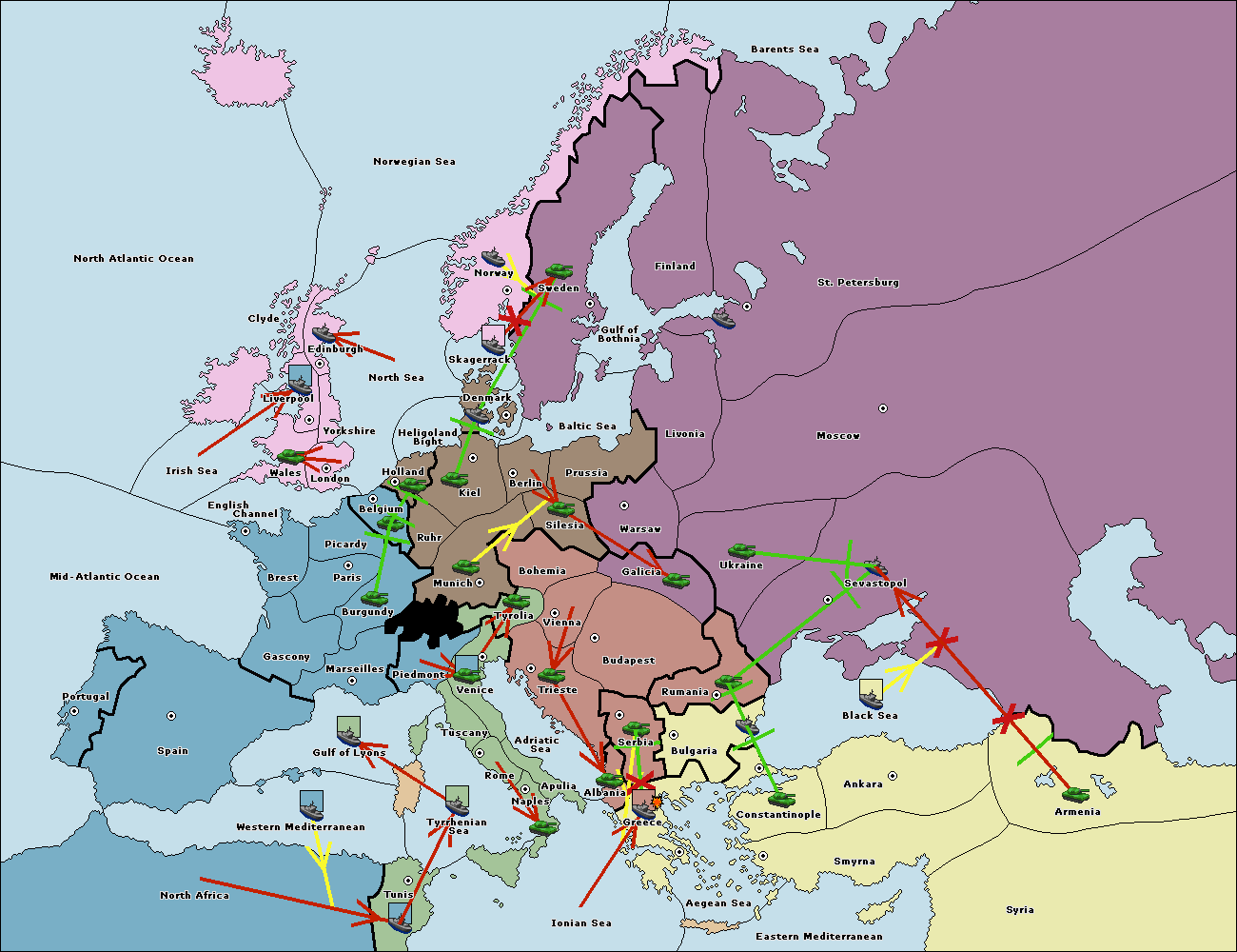 The fleet at Tyrrhenian Sea support move to Tunis from Ionian Sea.