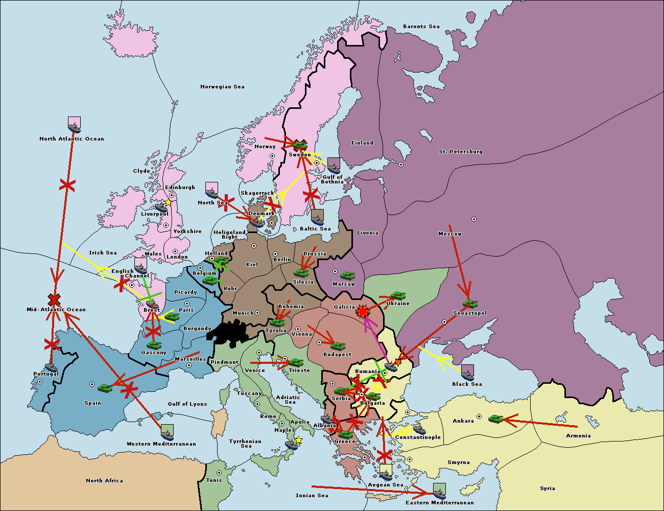 The fleet at Rumania support move to Bulgaria from Constantinople.