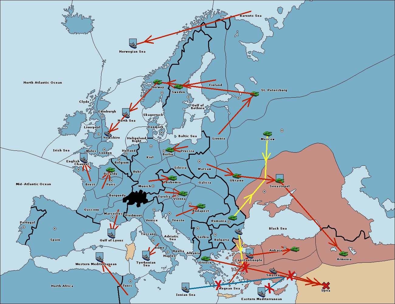 The fleet at Bulgaria (South Coast) move to Constantinople.